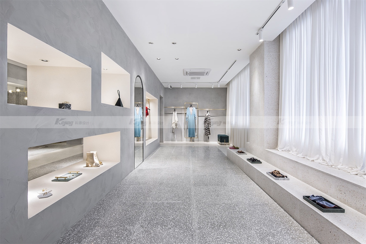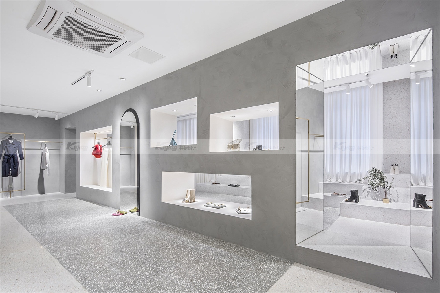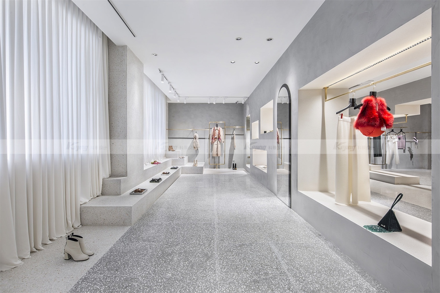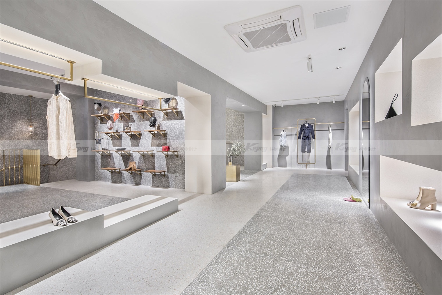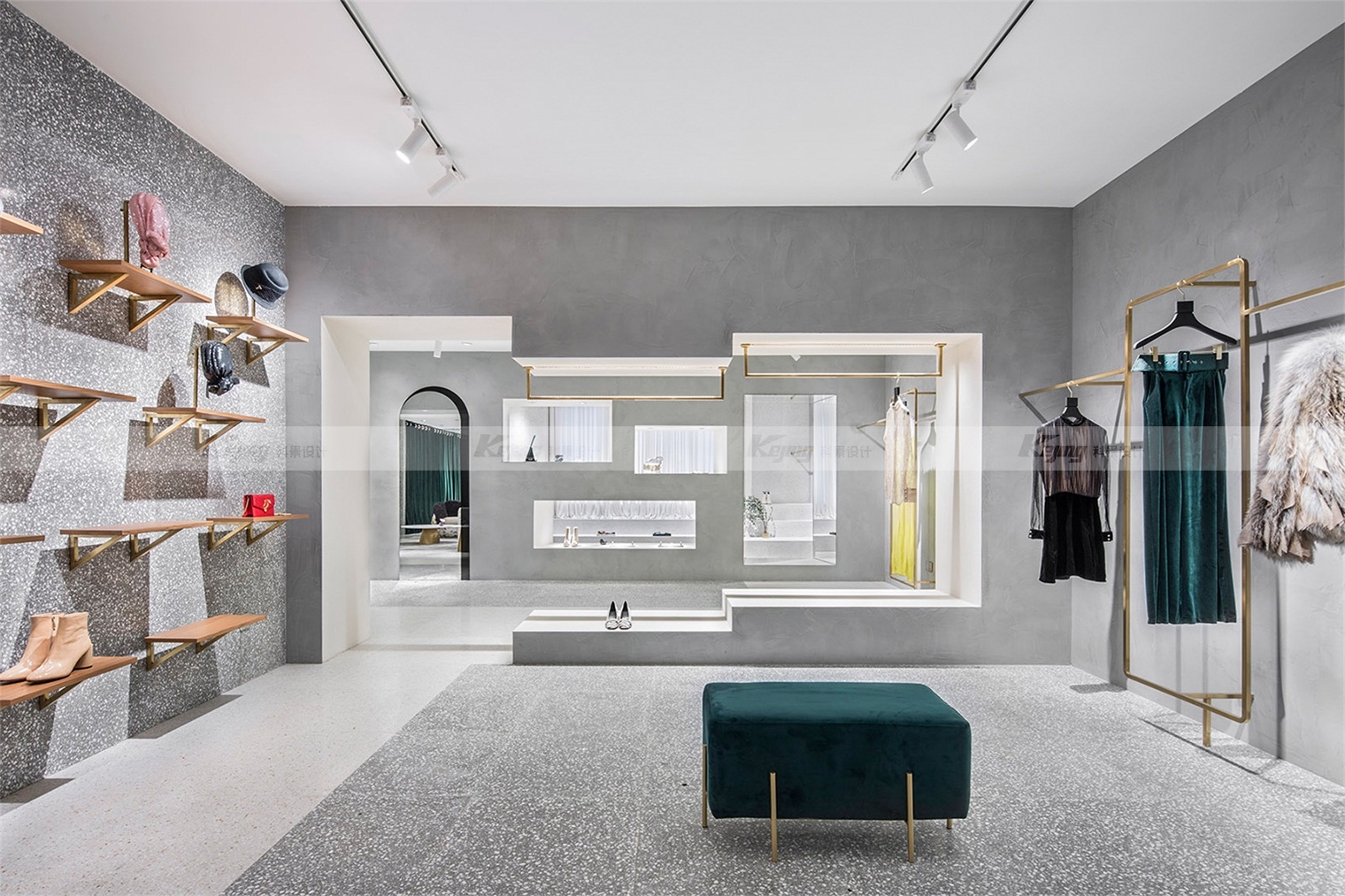 In the O.T.S. store, you can hardly see the display props, the space becomes the main part of the experience, and the "wall" creates a progressive relationship. Shoppers can have a wandering shopping experience here, especially on the second floor, the three-floor progressive space, during which shoppers roam, through different shapes of "hole in the wall", "you" and "I" look at each other as a landscape. The changing scene shopping experience also gives O.T.S its unique attributes. The main material of the project was a living terrazzo. Two terrazzo soles of light grey and white powder, combined with a light grey Malay paint with glossiness and hand-textured texture, coupled with the gold of the hanger rod, create a simple and elegant shopping atmosphere. The natural stone texture of terrazzo lays a pleasant and genial theme for the space. Meanwhile, such grain sense also reflects another intention of the design: "garden view", which finally fulfills our dream of "garden building" in this design.