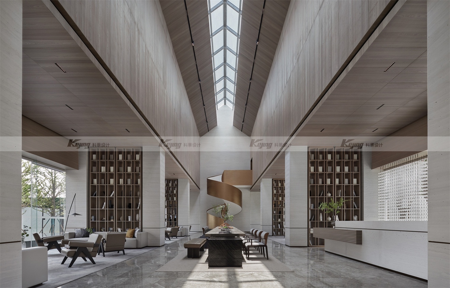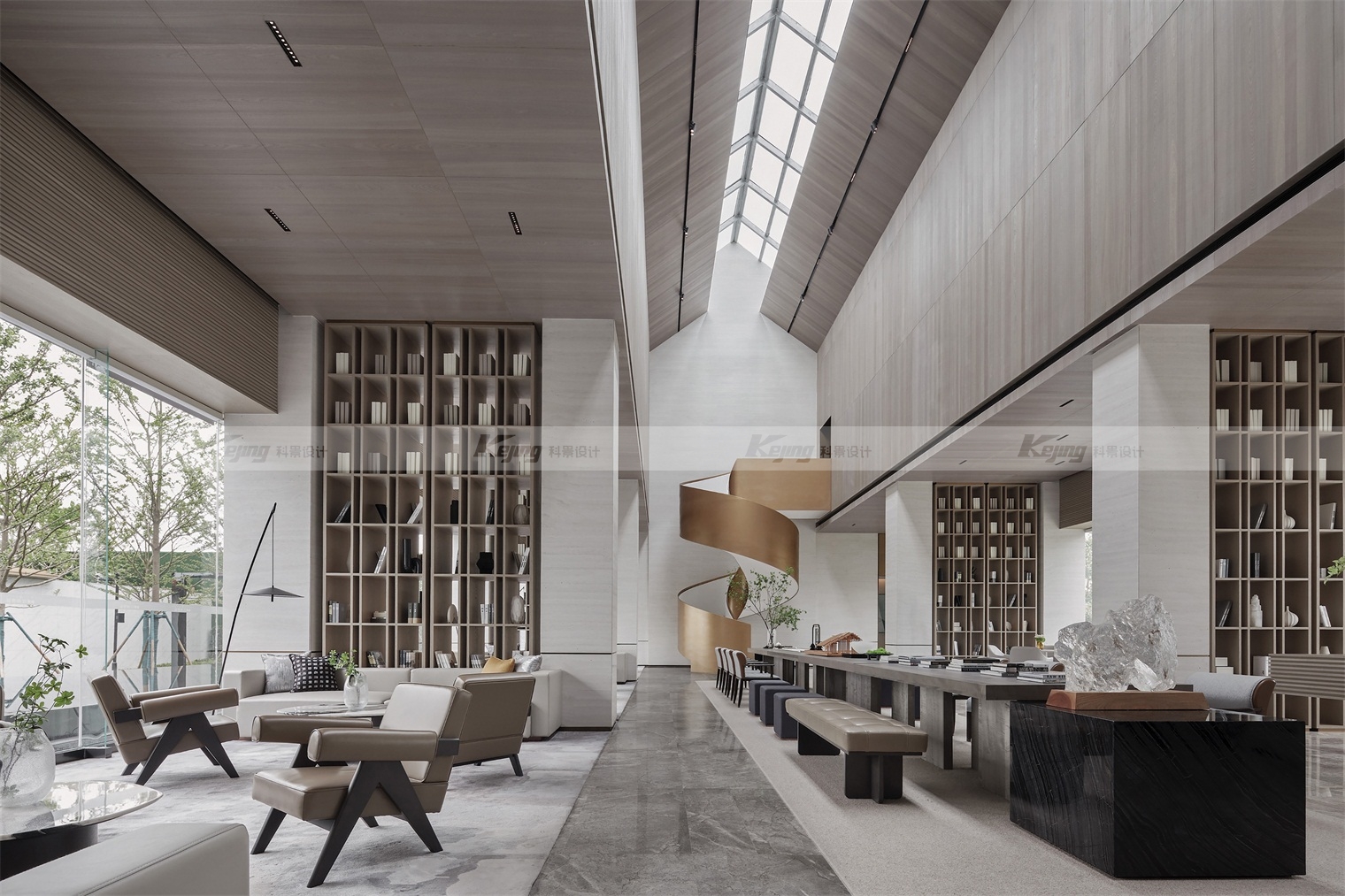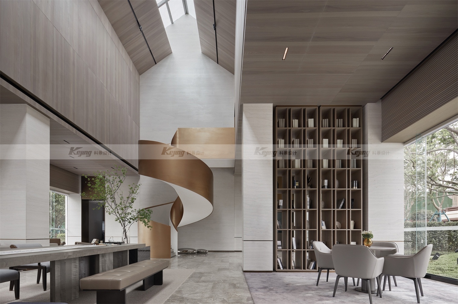 从现代主义、当代艺术、书院、美术馆、园林的方式切入,相互融合来讲述。晨光、午日、黄昏,不同时段、不同季节的阳光照进空间,亦如翁森“四时读书乐”中的精神家园。提出“ 将园林艺术中的东方审美,回应现代主义的自然与豁达。呈现柔和、雅洁,平静自然的和谐场域。”从中国古代山水书画中寻找设计的灵感,诗意的都市自然,新的美学特征诠释文化意境,回归自然的场所精神。