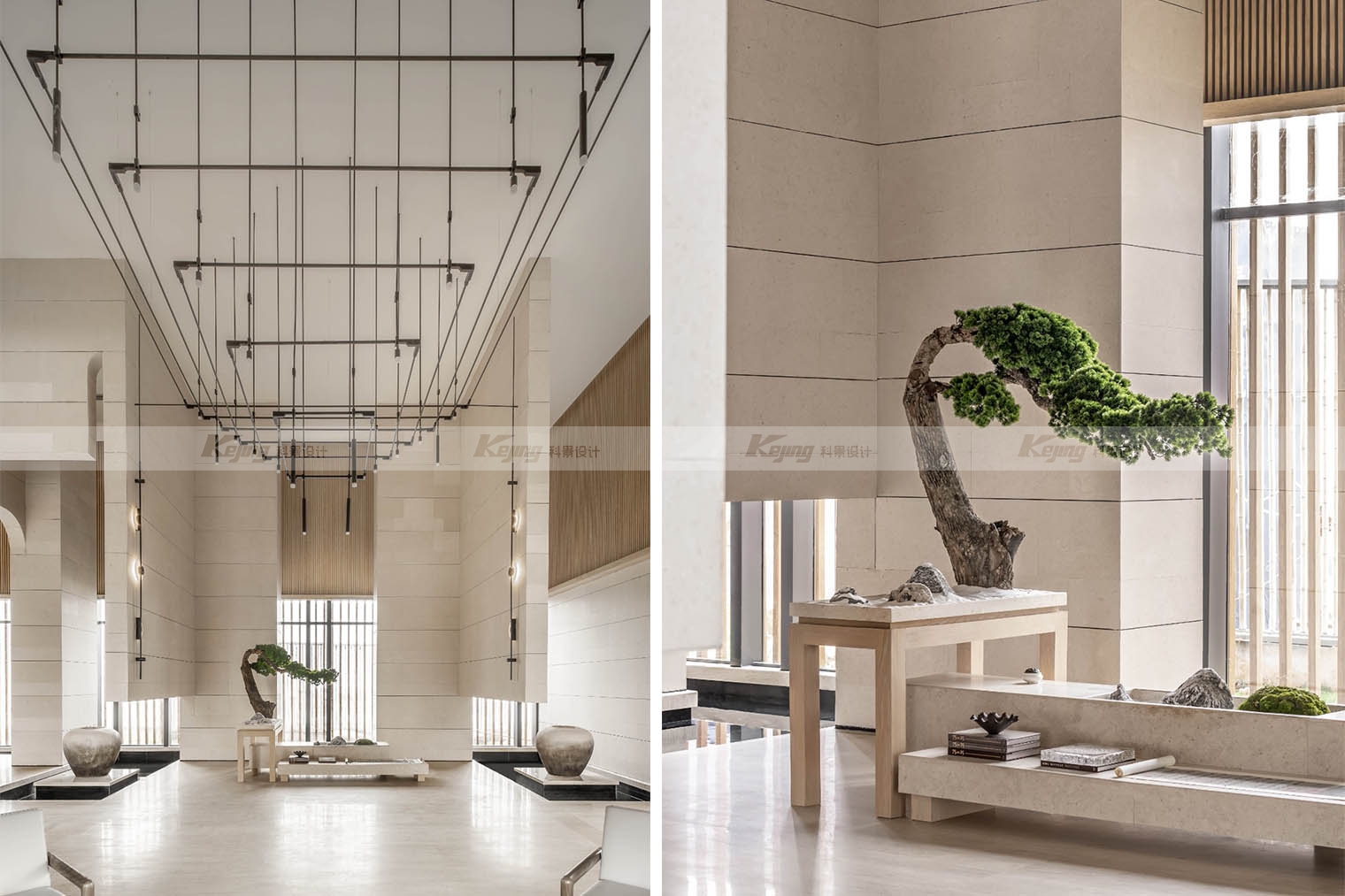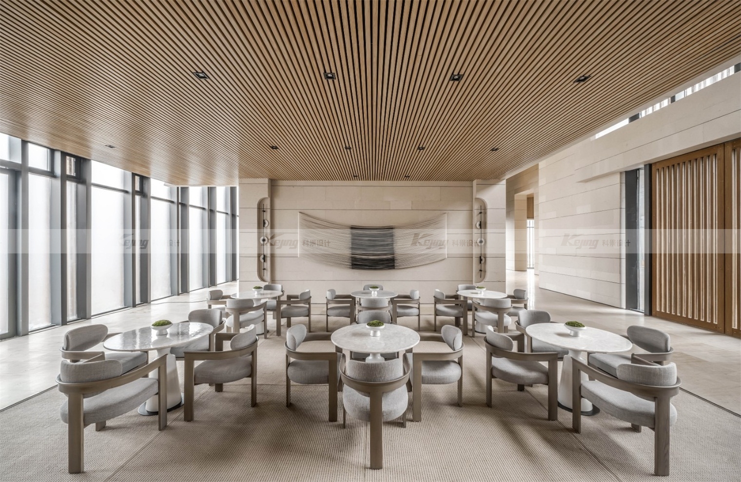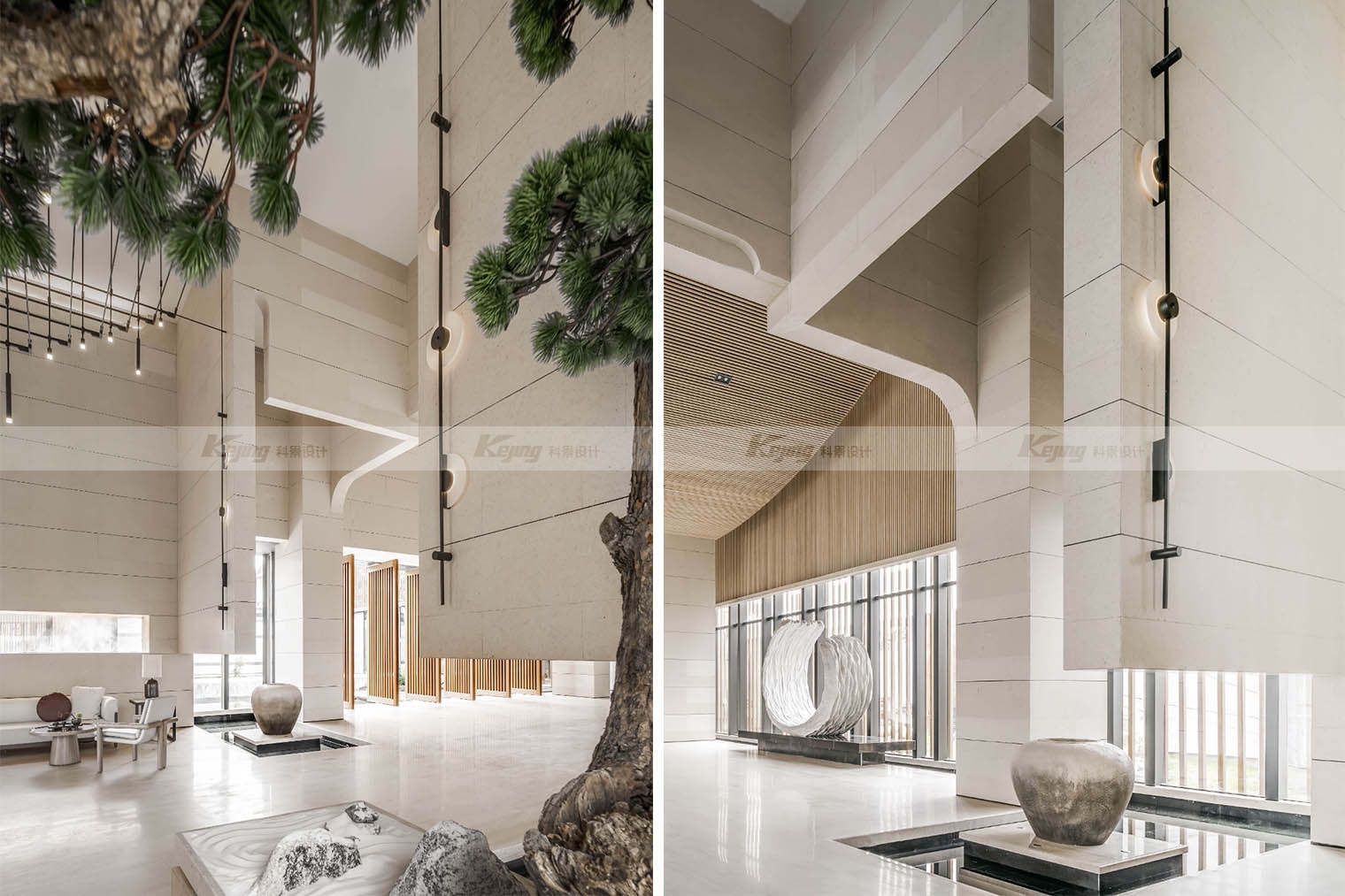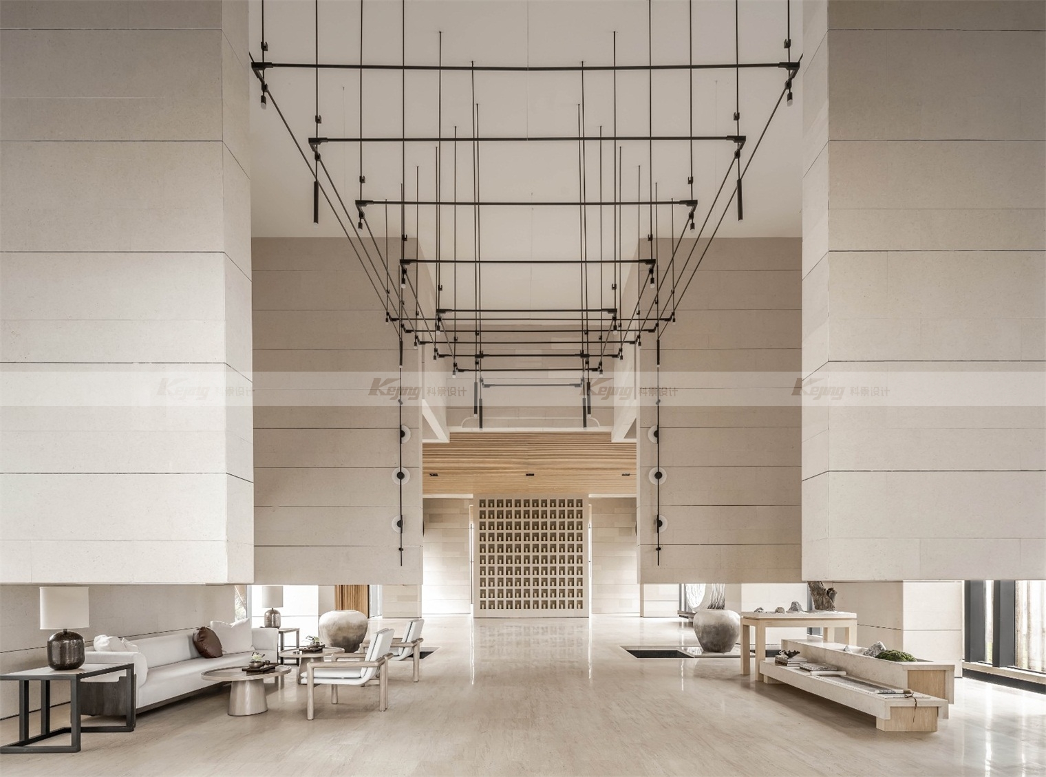 设计师先采用东方古典的对称美学,稳定空间比例,又给予空间极具气势的高挑空设计,让空间带出波澜壮阔又宁静四野的庄严感。干净简洁的墙面,一片一片的留白,稳定了人的心境。空间大量运用了对称的中国结构美学,或四角成对,或两两相对中,于步移景异间,都能看见优雅的结构美。在这个禅学空间,不断看到了经过淬炼的现代美学思维,显出毫无违和的舒适与细腻。