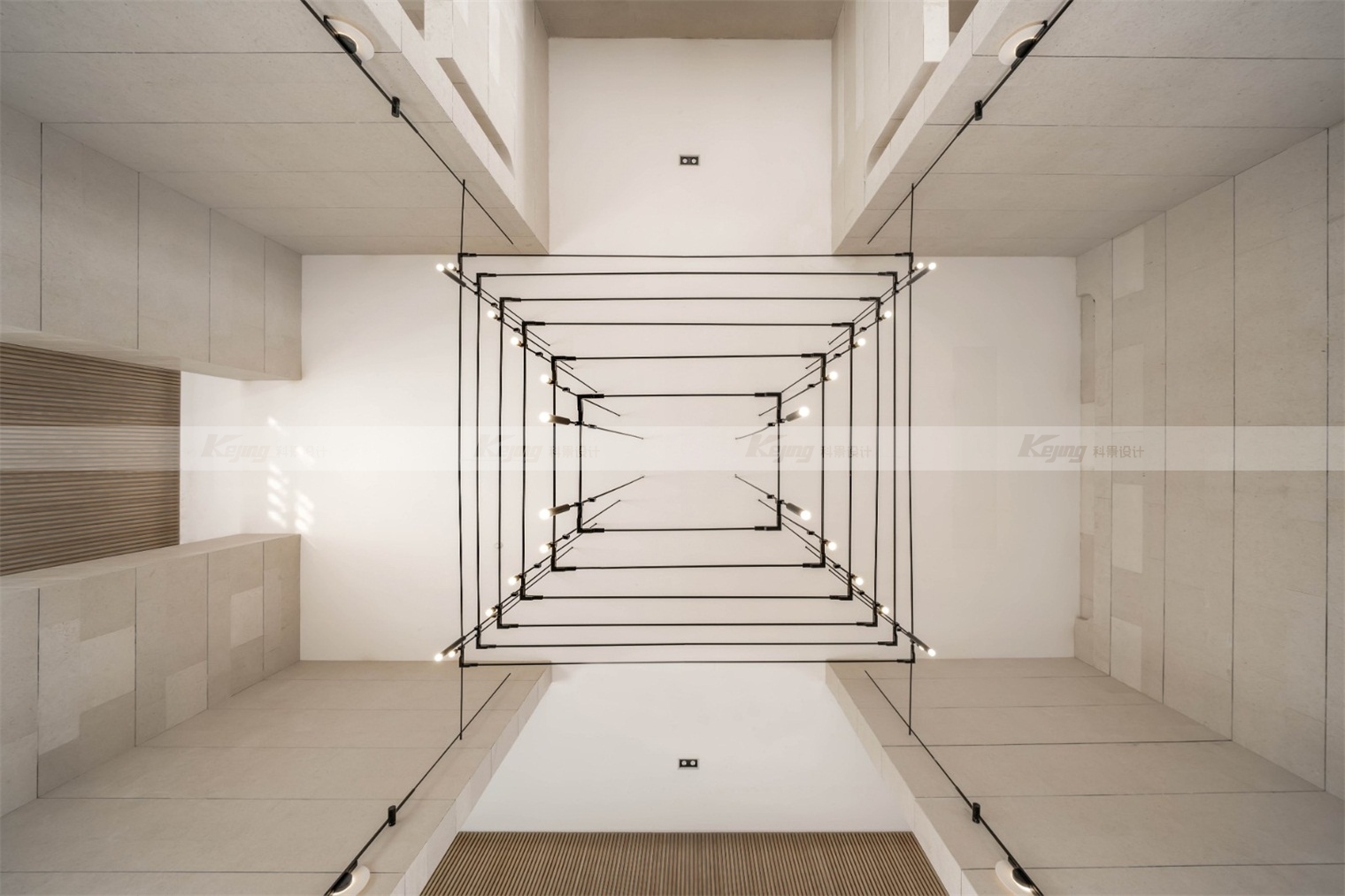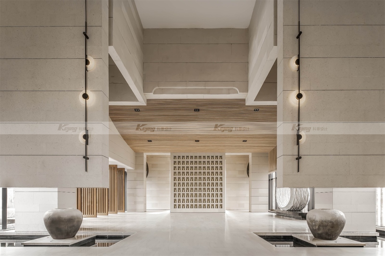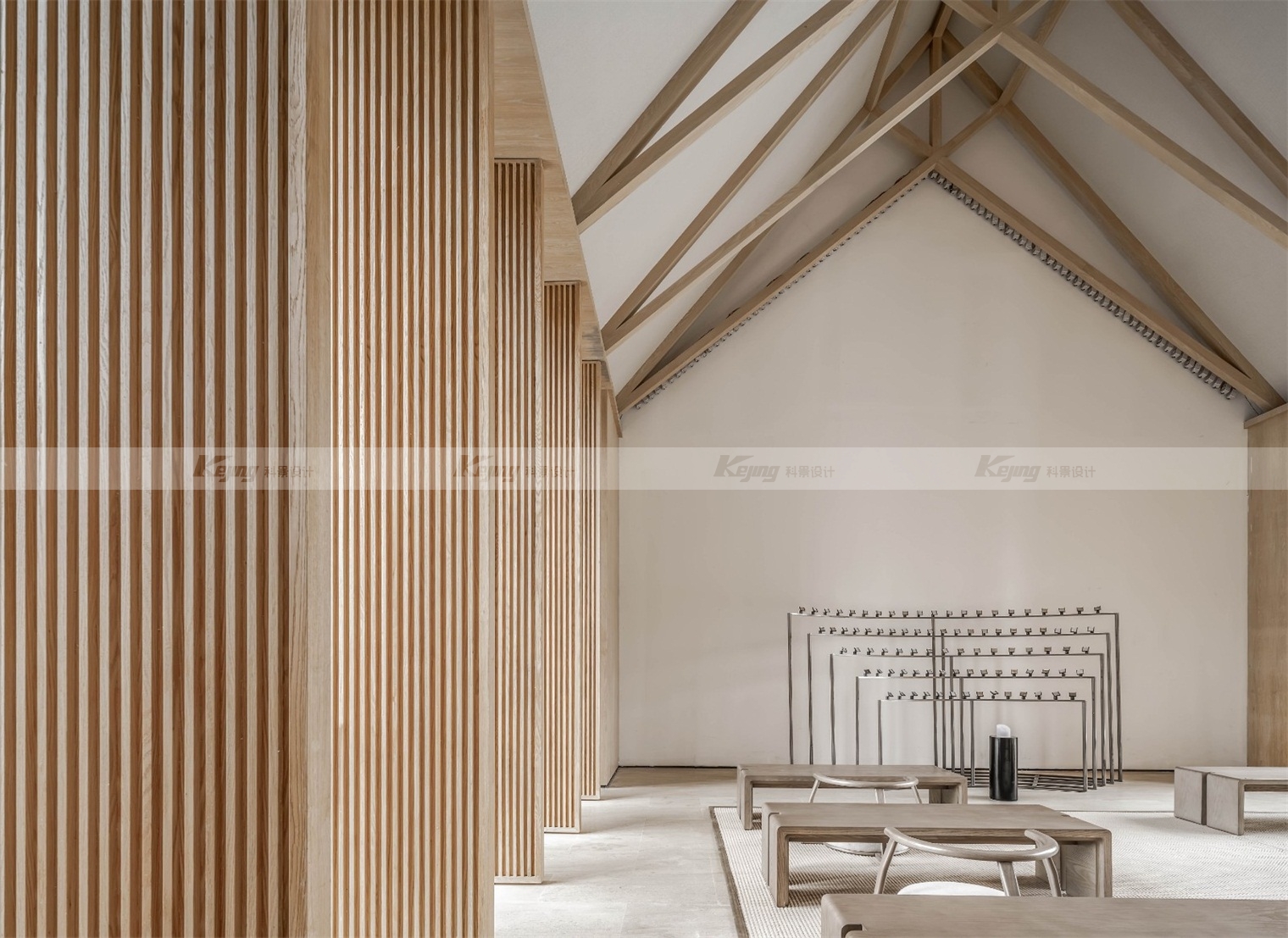 设计师先采用东方古典的对称美学,稳定空间比例,又给予空间极具气势的高挑空设计,让空间带出波澜壮阔又宁静四野的庄严感。干净简洁的墙面,一片一片的留白,稳定了人的心境。空间大量运用了对称的中国结构美学,或四角成对,或两两相对中,于步移景异间,都能看见优雅的结构美。在这个禅学空间,不断看到了经过淬炼的现代美学思维,显出毫无违和的舒适与细腻。