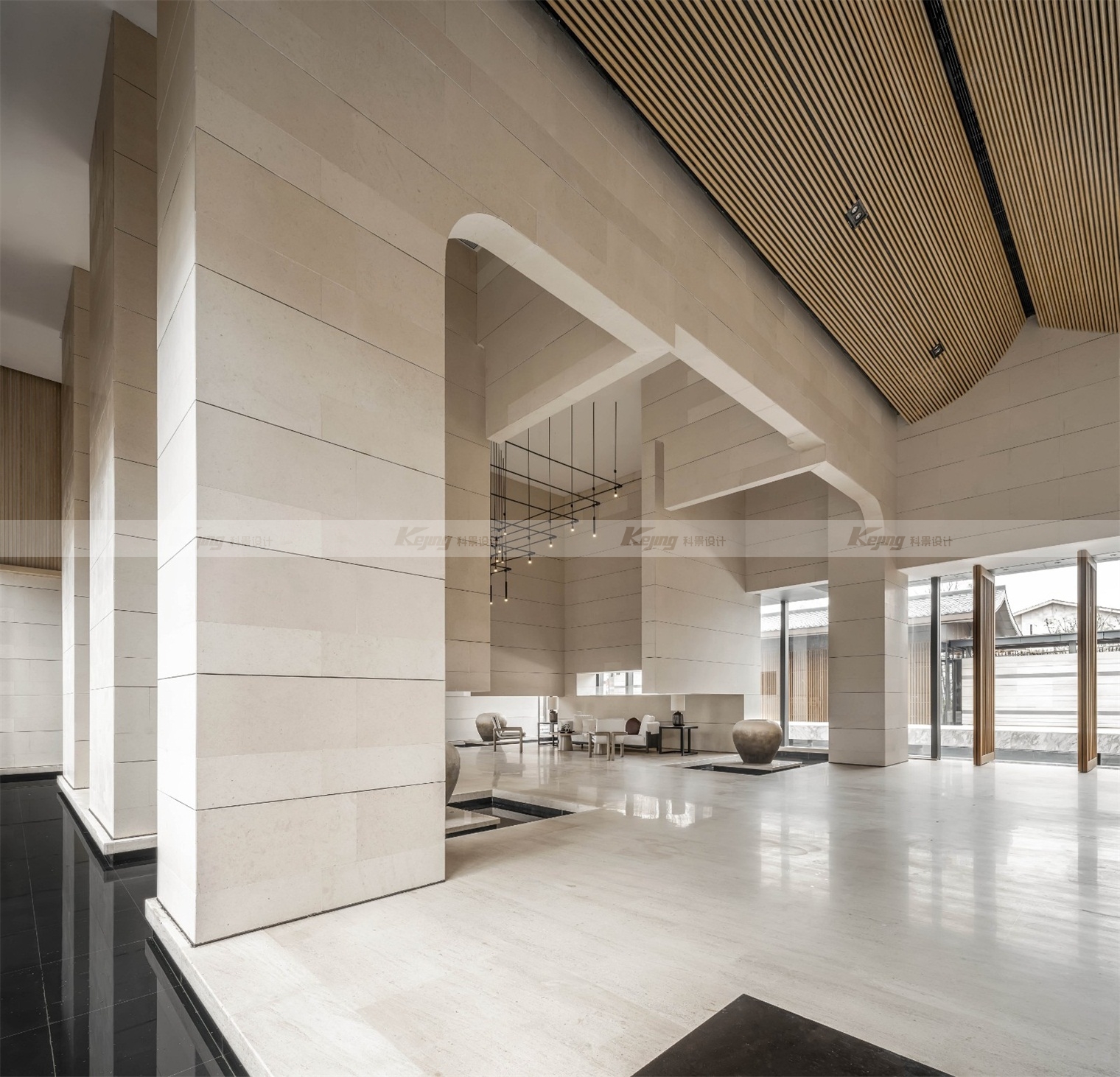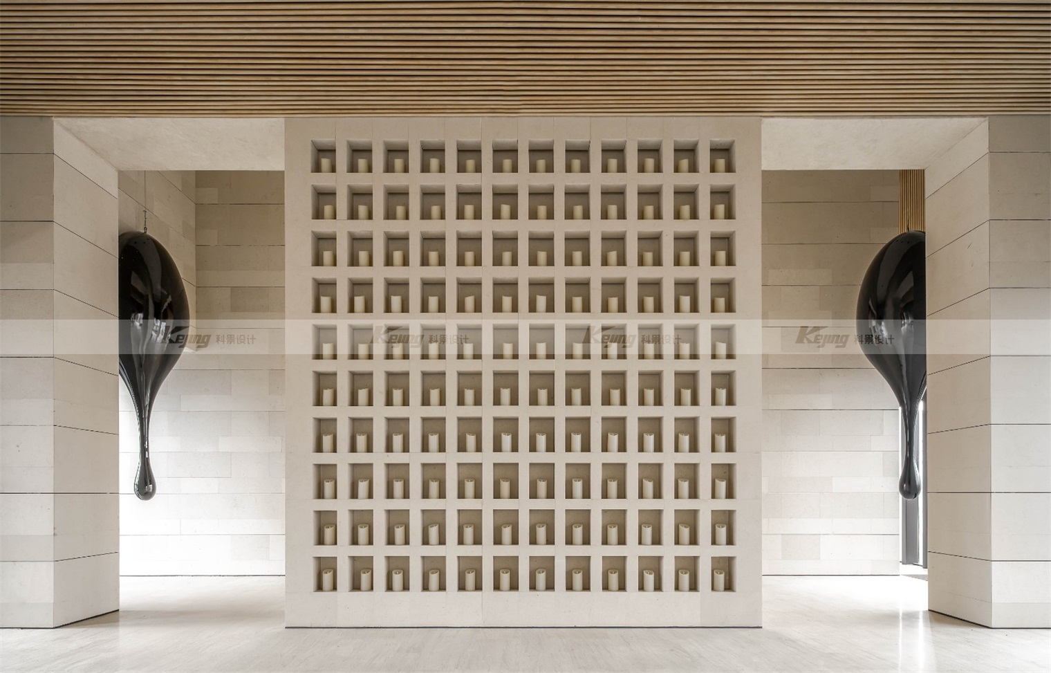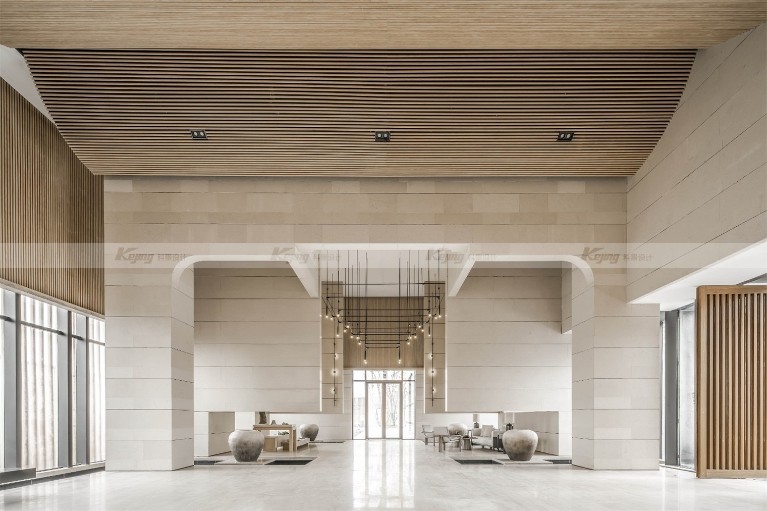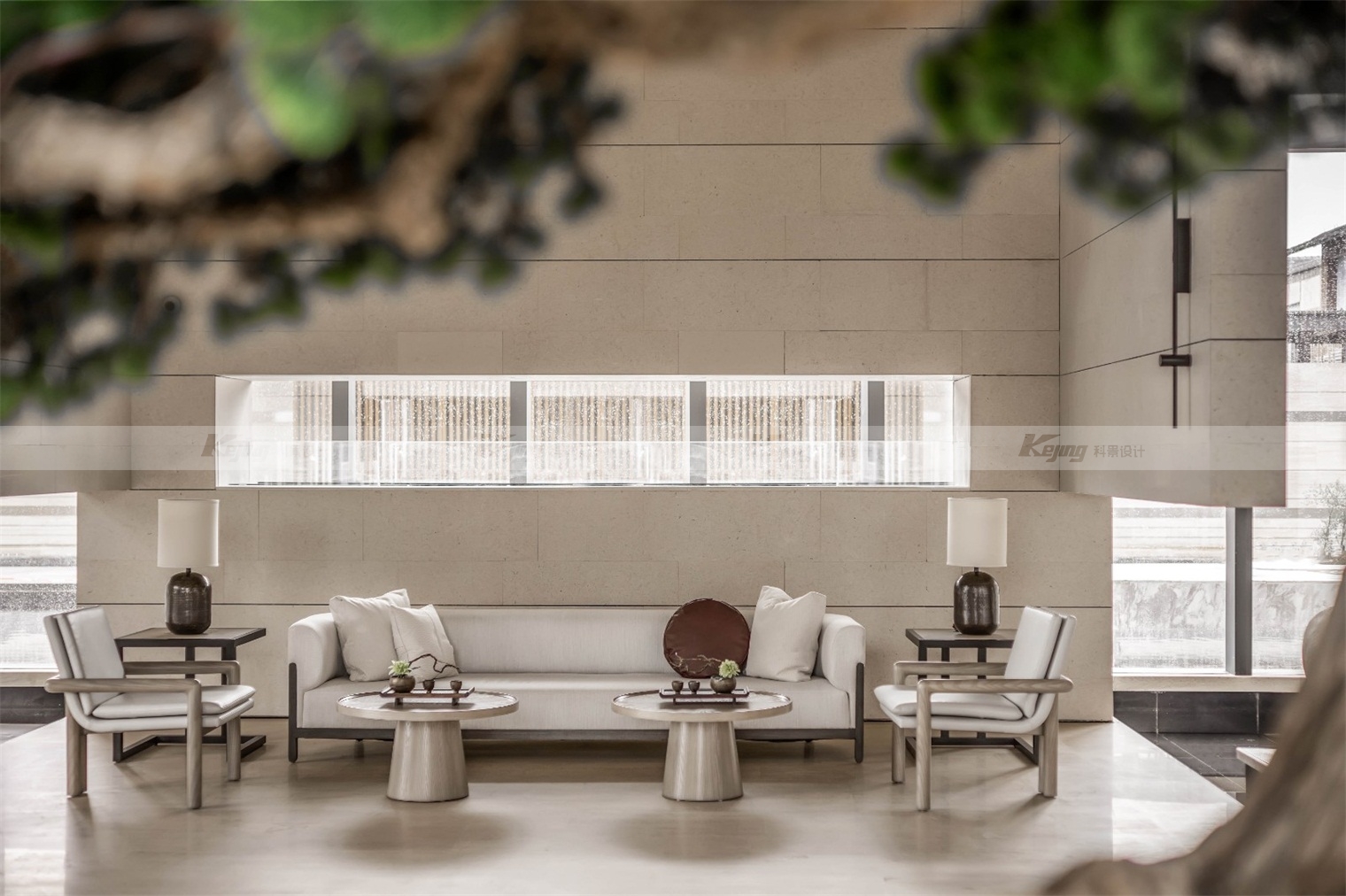 设计师先采用东方古典的对称美学,稳定空间比例,又给予空间极具气势的高挑空设计,让空间带出波澜壮阔又宁静四野的庄严感。干净简洁的墙面,一片一片的留白,稳定了人的心境。空间大量运用了对称的中国结构美学,或四角成对,或两两相对中,于步移景异间,都能看见优雅的结构美。在这个禅学空间,不断看到了经过淬炼的现代美学思维,显出毫无违和的舒适与细腻。