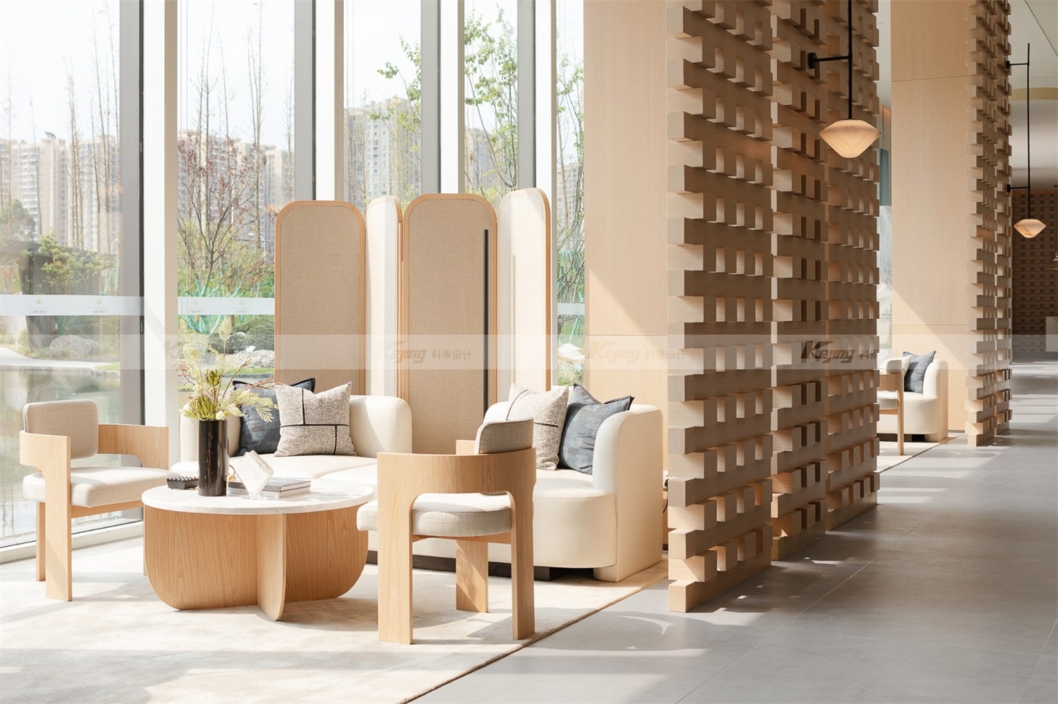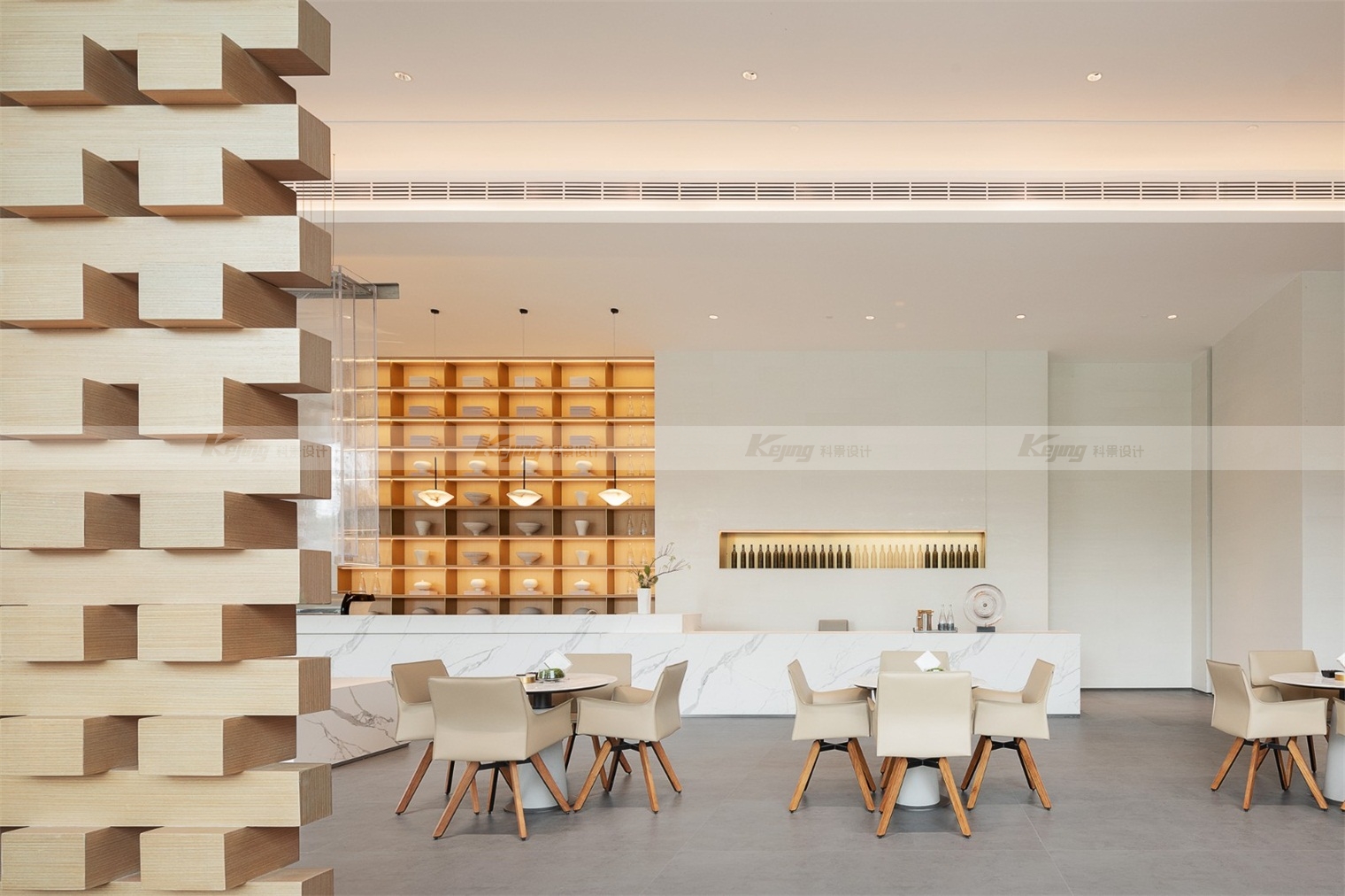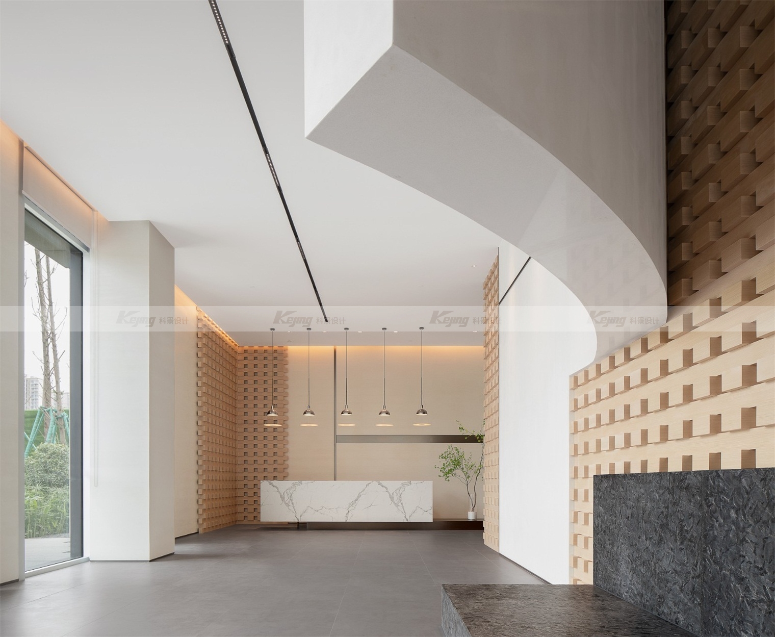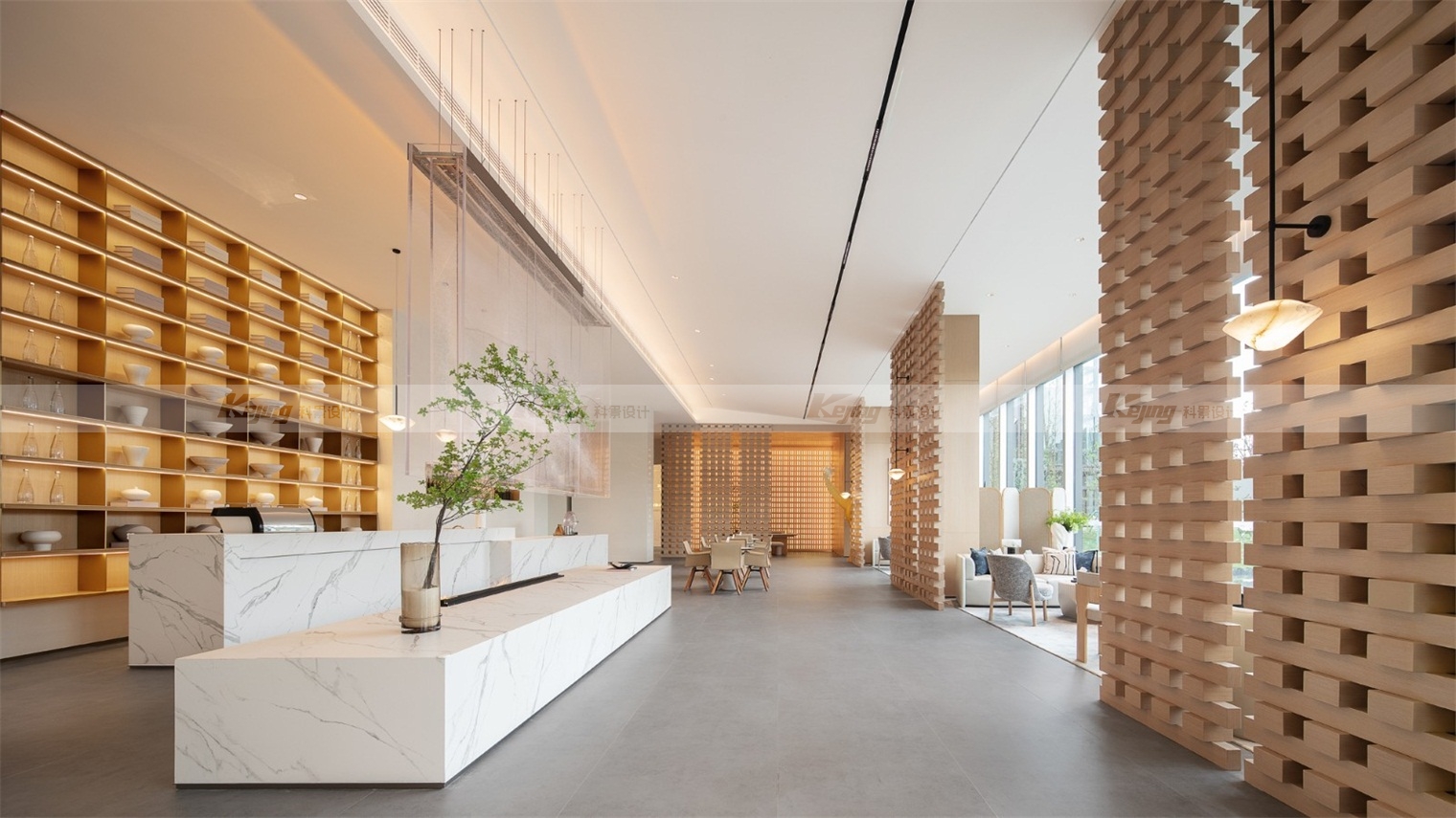 西园之树,停云载荣,以山为根,以海为载。在空间整体色调上选择明快清爽的白色、有温度的原木色构成整个空间的色彩基调,在形式上用简洁几何线条平衡空间的美感与功能需求,为空间注入清爽鲜活。