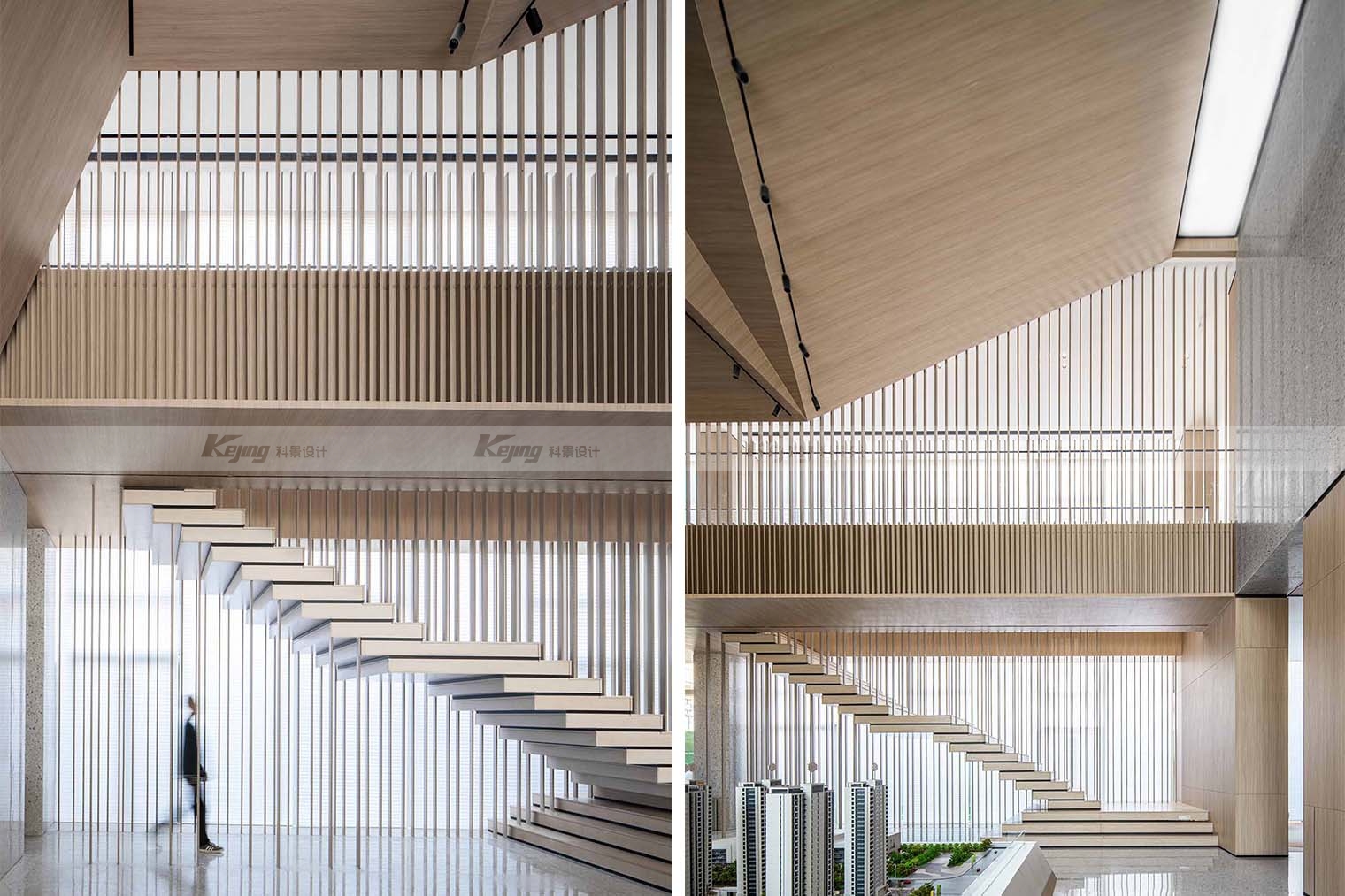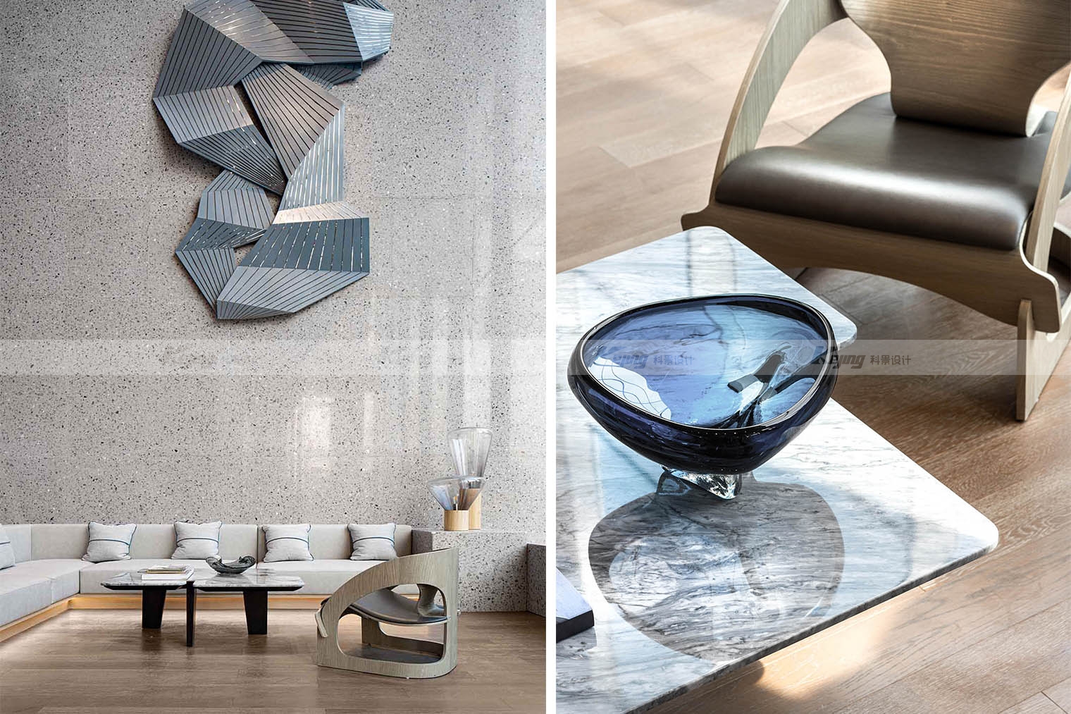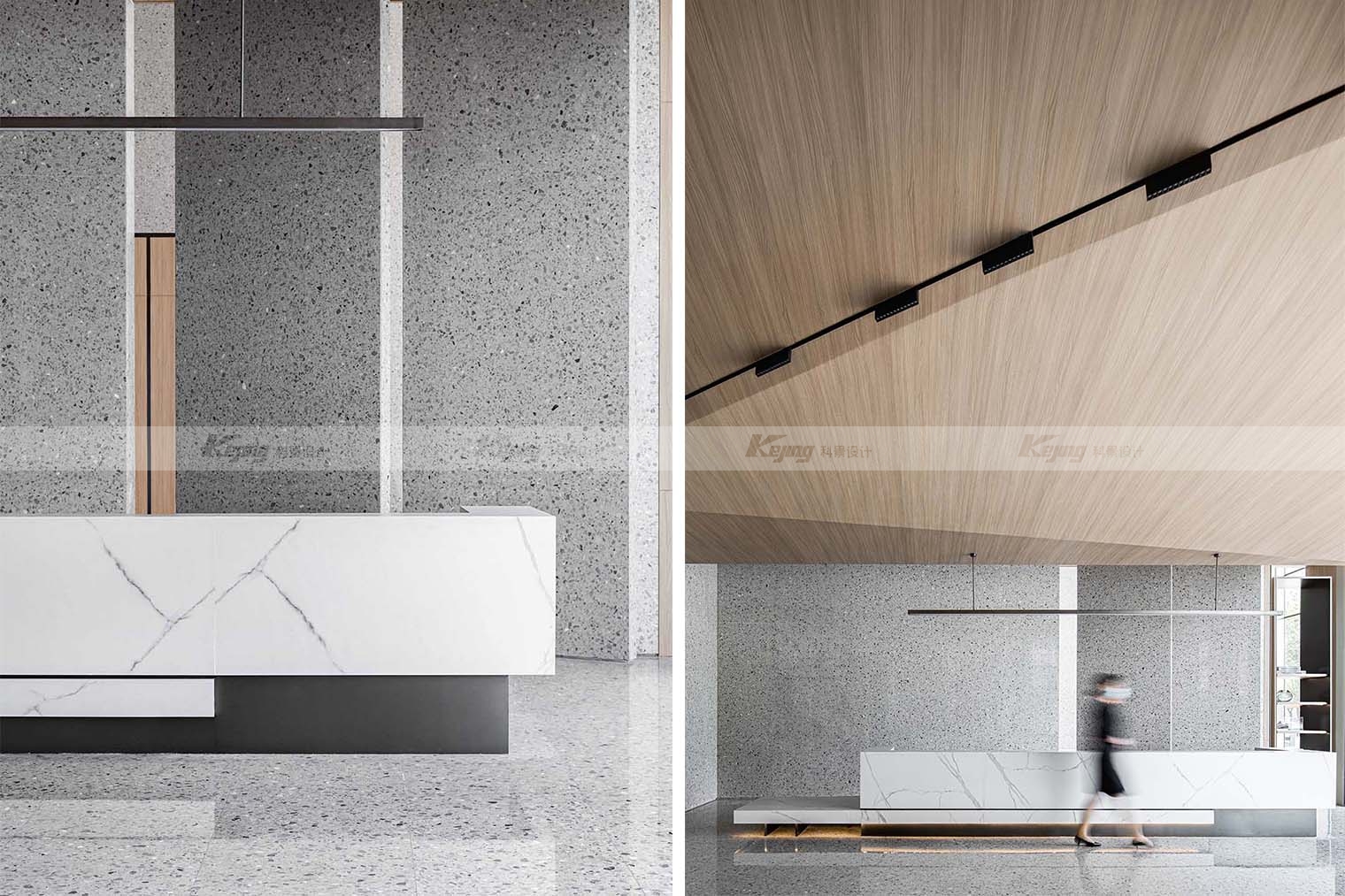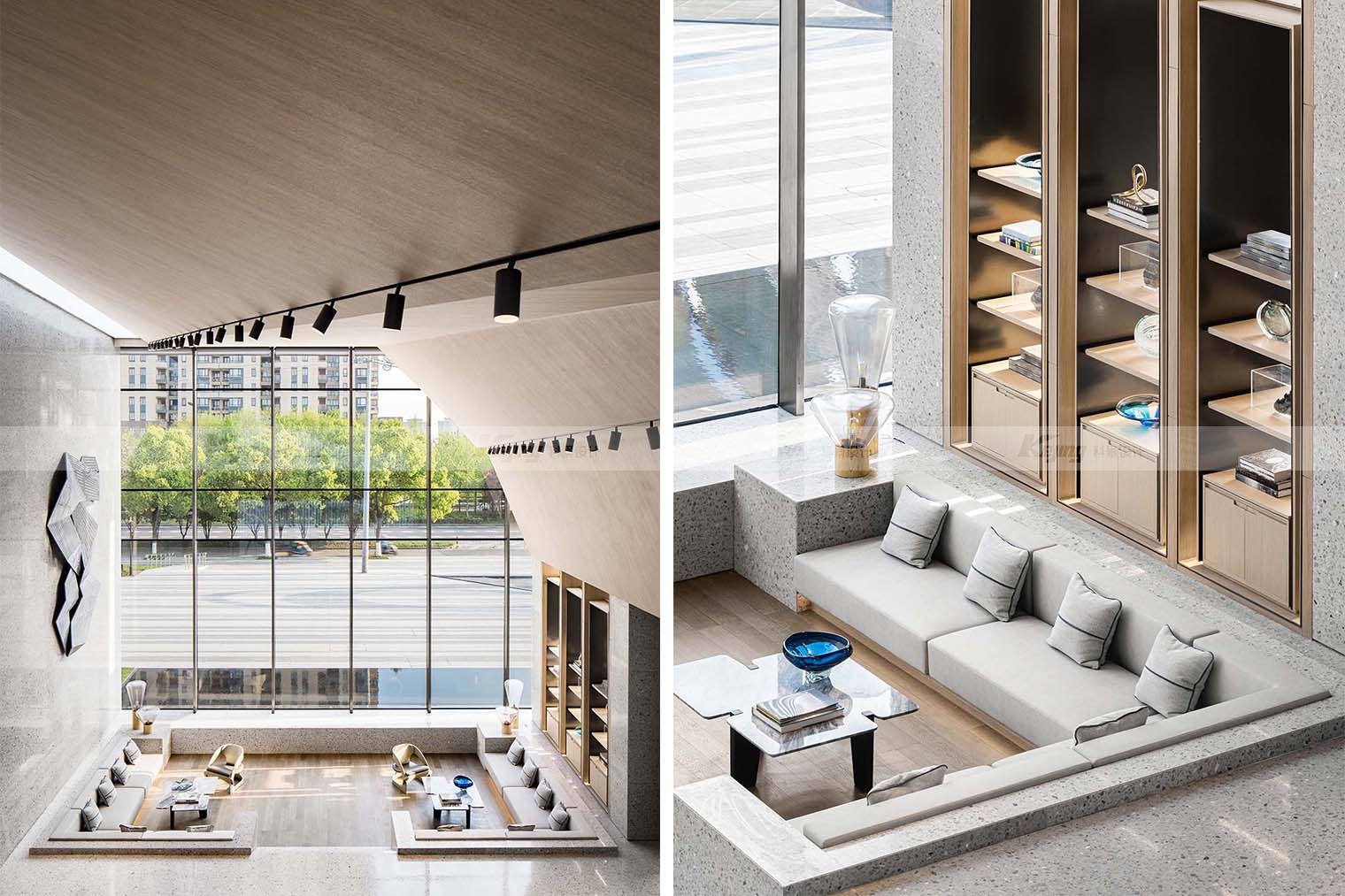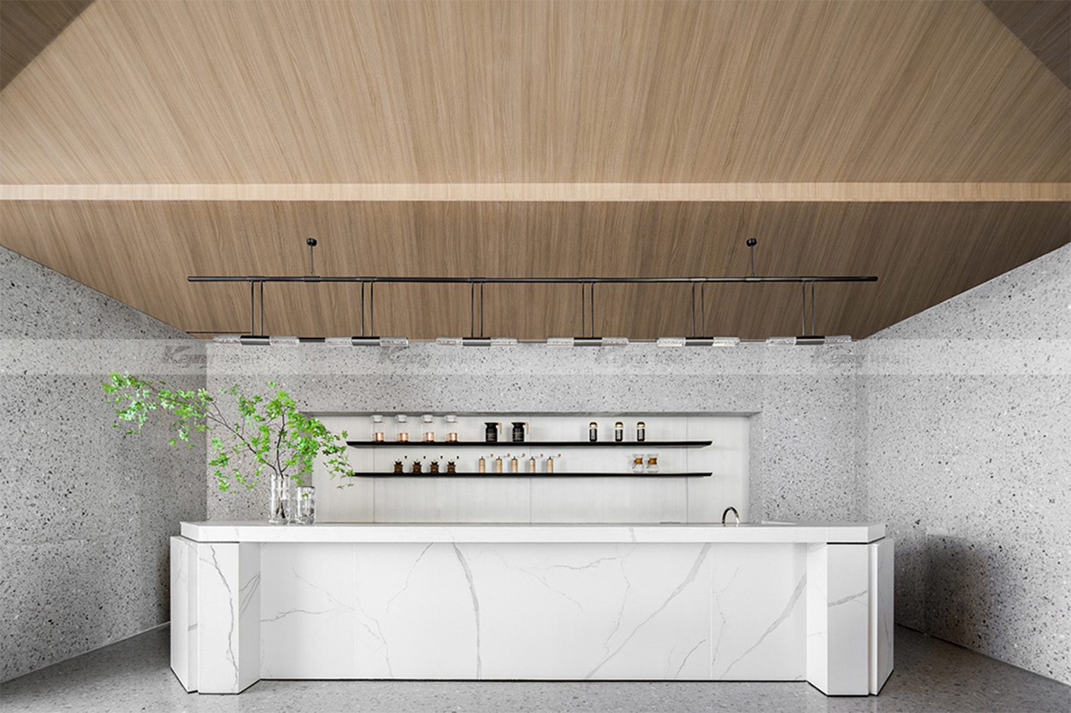 一种心照不宣的见解是,简约的设计是最困难的。减少缀饰,用体块的削减、堆叠与线条、材质的碰撞来实现的空间的丰富。本案运用简而有力的笔法,使木与石相生共构,令纯净的空间气质流淌于旭辉城的空间设计中。在空间中,使用减法策略,去除繁多的装饰件与结构体,通过体块的凹凸与层次,打造内部空间的质感。使用水磨石制成独立体块,创造跳脱的动态视觉效果。通过体块之间的间隔引入自然光,光线本身赋予了水磨石色彩的渐变,突出了形体光影和虚实的变化。