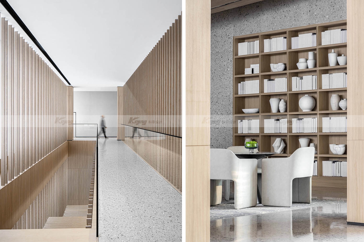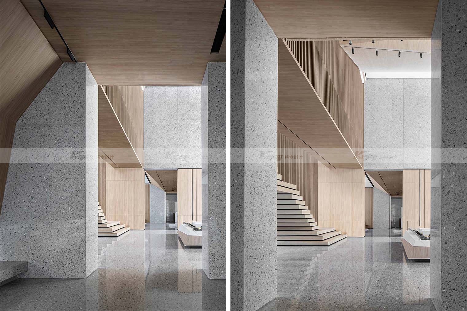 One tacit understanding is that simplicity is the hardest part of design. Reduce finishes, enrich the space with volume cuts, stacks and colliding lines and materials. This case USES the simple and powerful brushwork, causes the wood and the stone phase to produce the common structure, causes the pure space temperament to flow in the Xuhui city space design. In the space, the subtraction strategy is used to remove various decorative parts and structures, and create the texture of the internal space through the bump and level of the volume. Use terrazzo to make individual blocks to create a jump-off dynamic visual effect. Natural light is introduced through the space between the volumes, the light itself gives the terrazzo color gradient, highlighting the shape of light and shadow and virtual and real changes.