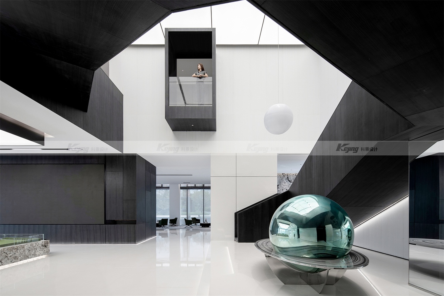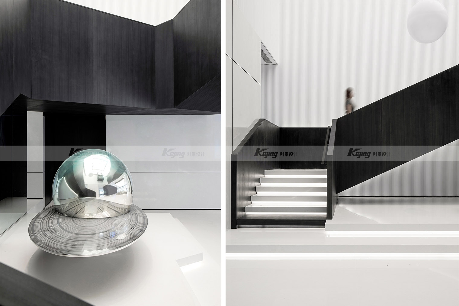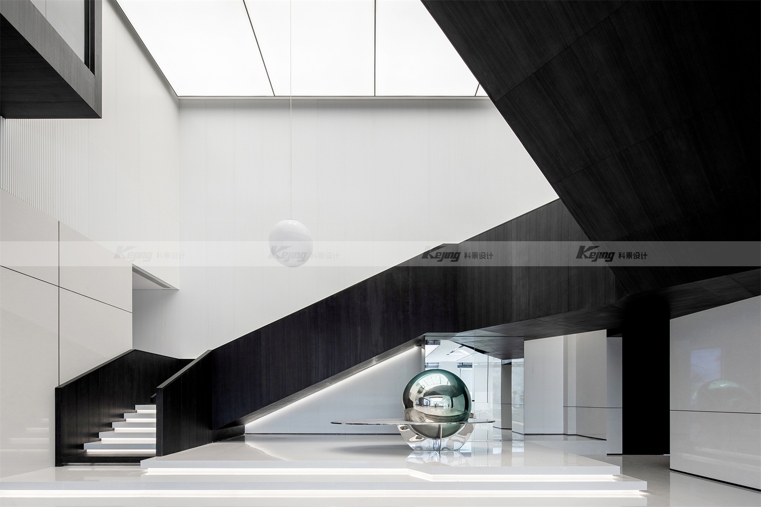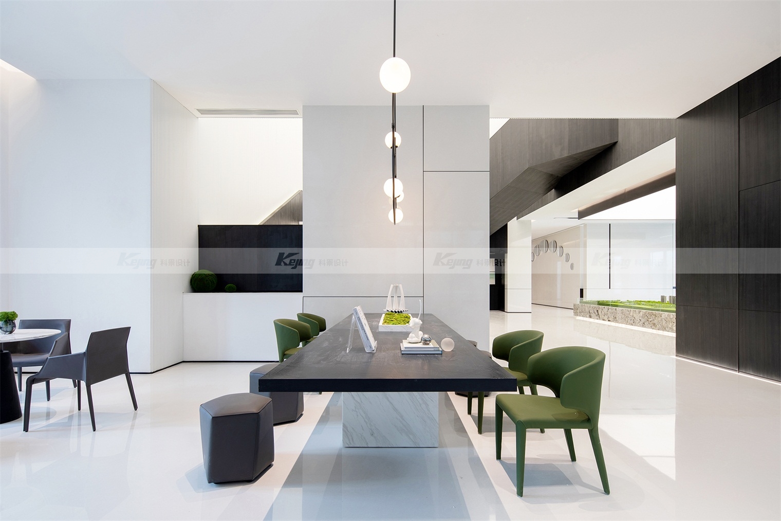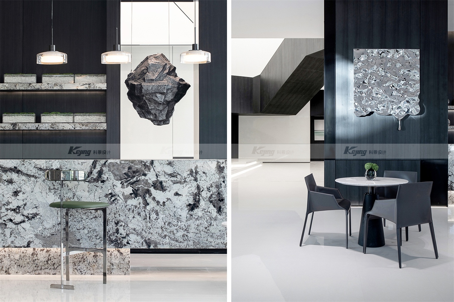空间中,直线与折线将不同的功能区简明勾勒划分;大面积材质铺陈装饰弱化了不必要的细节;黑与白的交替、变幻如同明确的节奏韵律;艺术品和景观则是城市和山水之间雀跃的生命力。从一层到二层,万橡设计抽象构建了一座被山石、河流滋养的城市,又因为艺术品的置入与打破常规的结构笔触,将这座城市带入了充满想象的宇宙空间中。在结构、线条和色彩变化中,空间与这座城市一样,自成风骨。