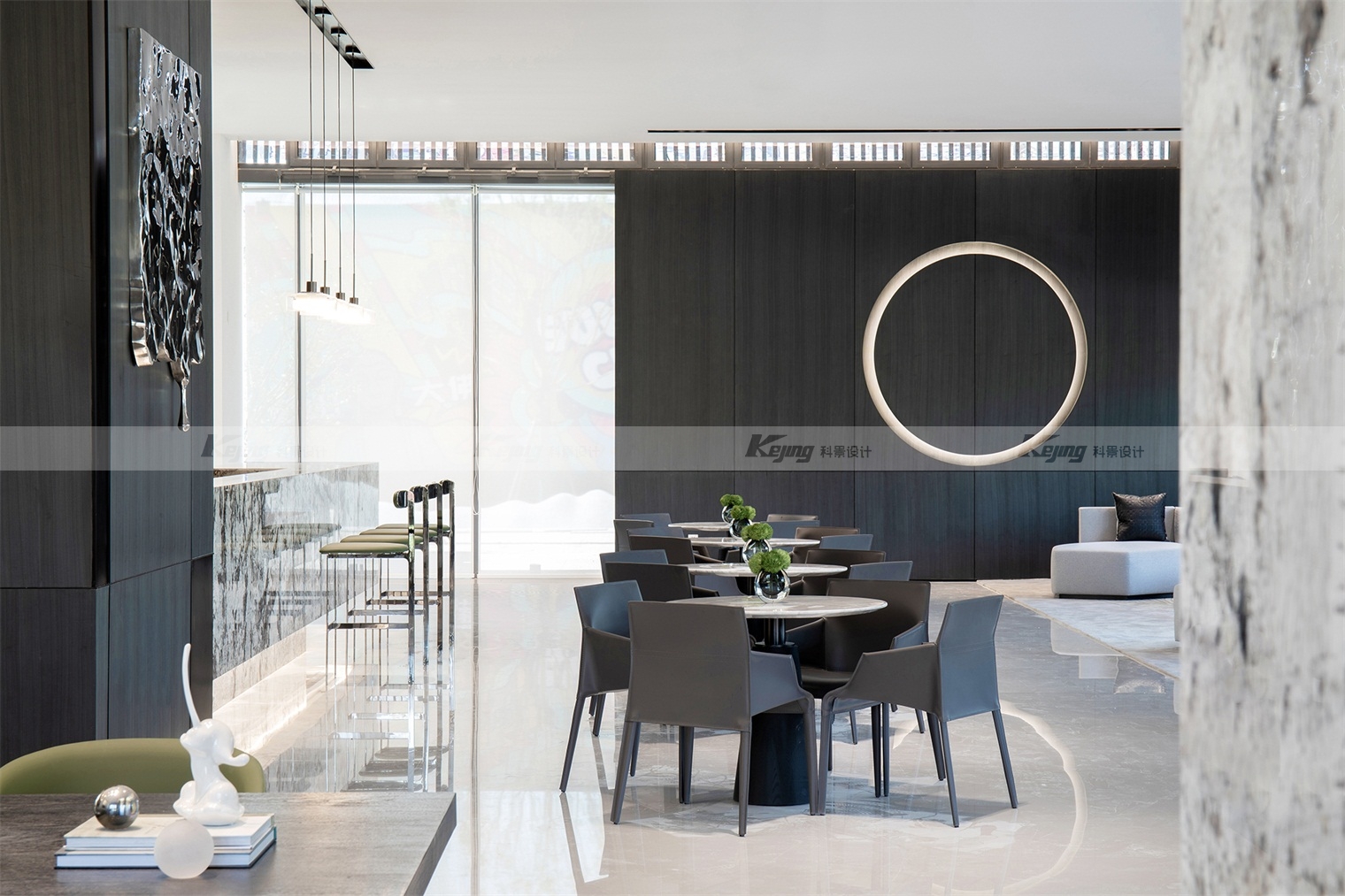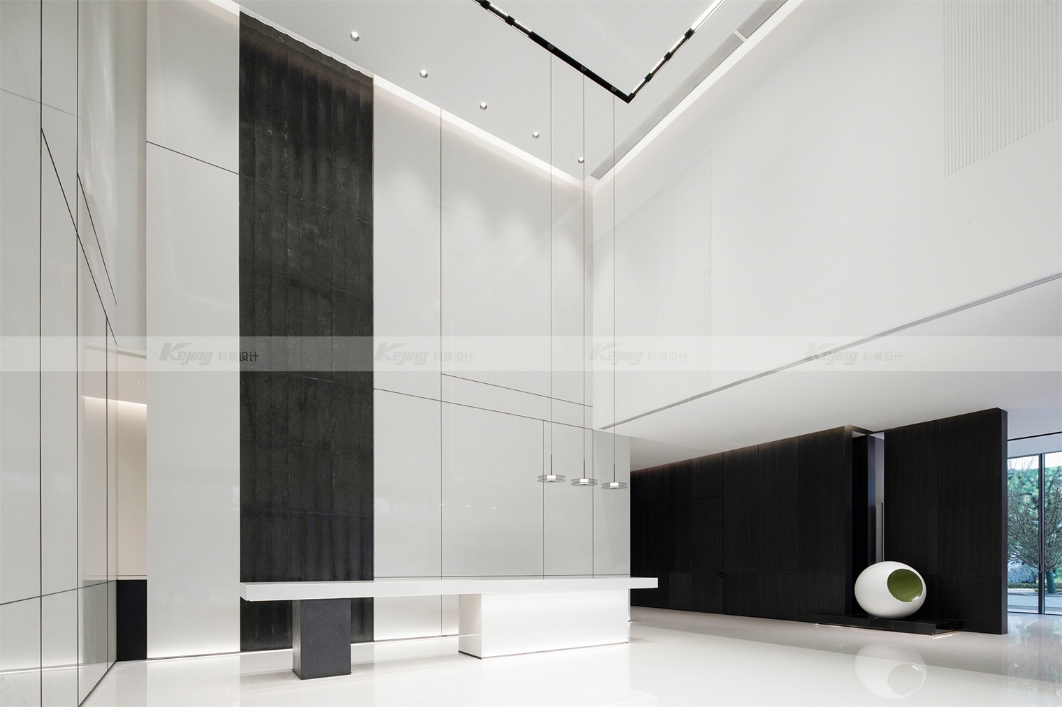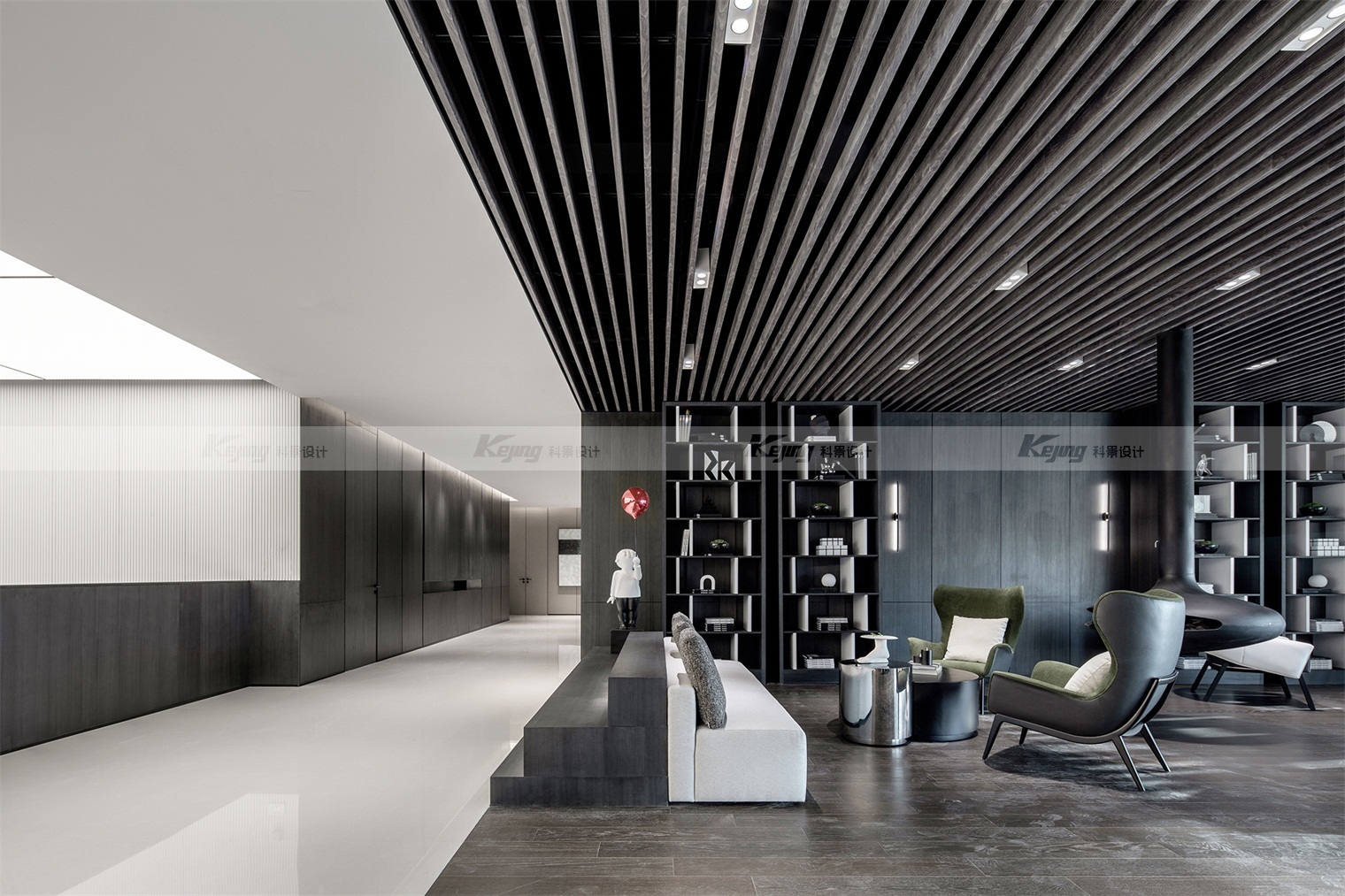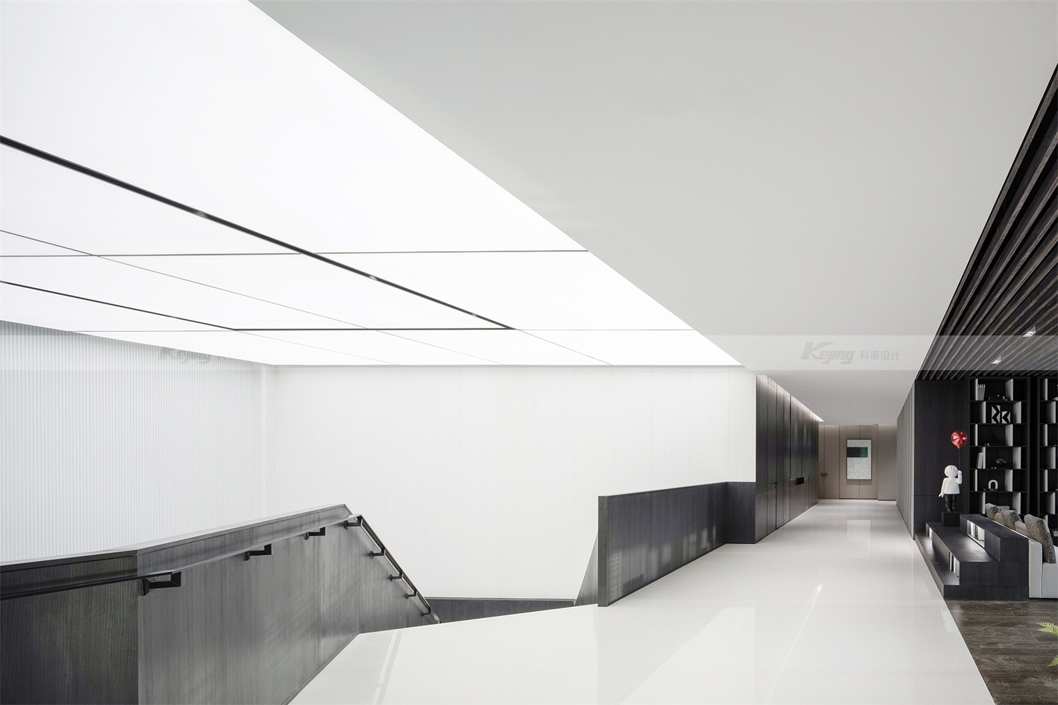 空间中,直线与折线将不同的功能区简明勾勒划分;大面积材质铺陈装饰弱化了不必要的细节;黑与白的交替、变幻如同明确的节奏韵律;艺术品和景观则是城市和山水之间雀跃的生命力。从一层到二层,万橡设计抽象构建了一座被山石、河流滋养的城市,又因为艺术品的置入与打破常规的结构笔触,将这座城市带入了充满想象的宇宙空间中。在结构、线条和色彩变化中,空间与这座城市一样,自成风骨。