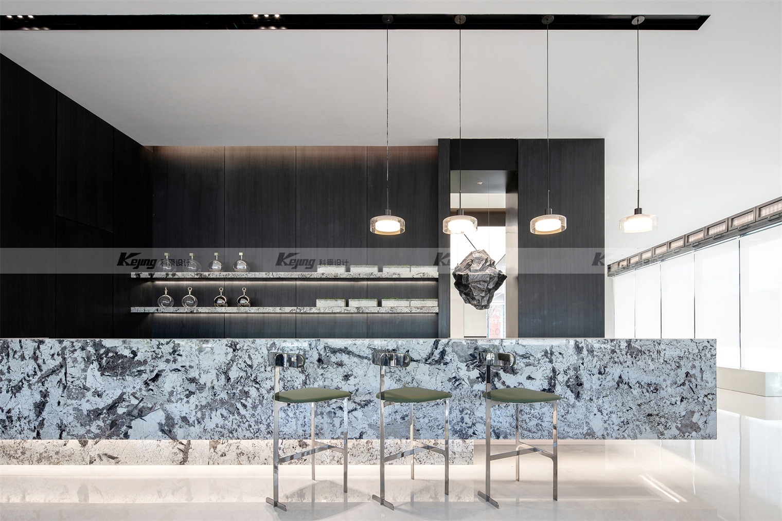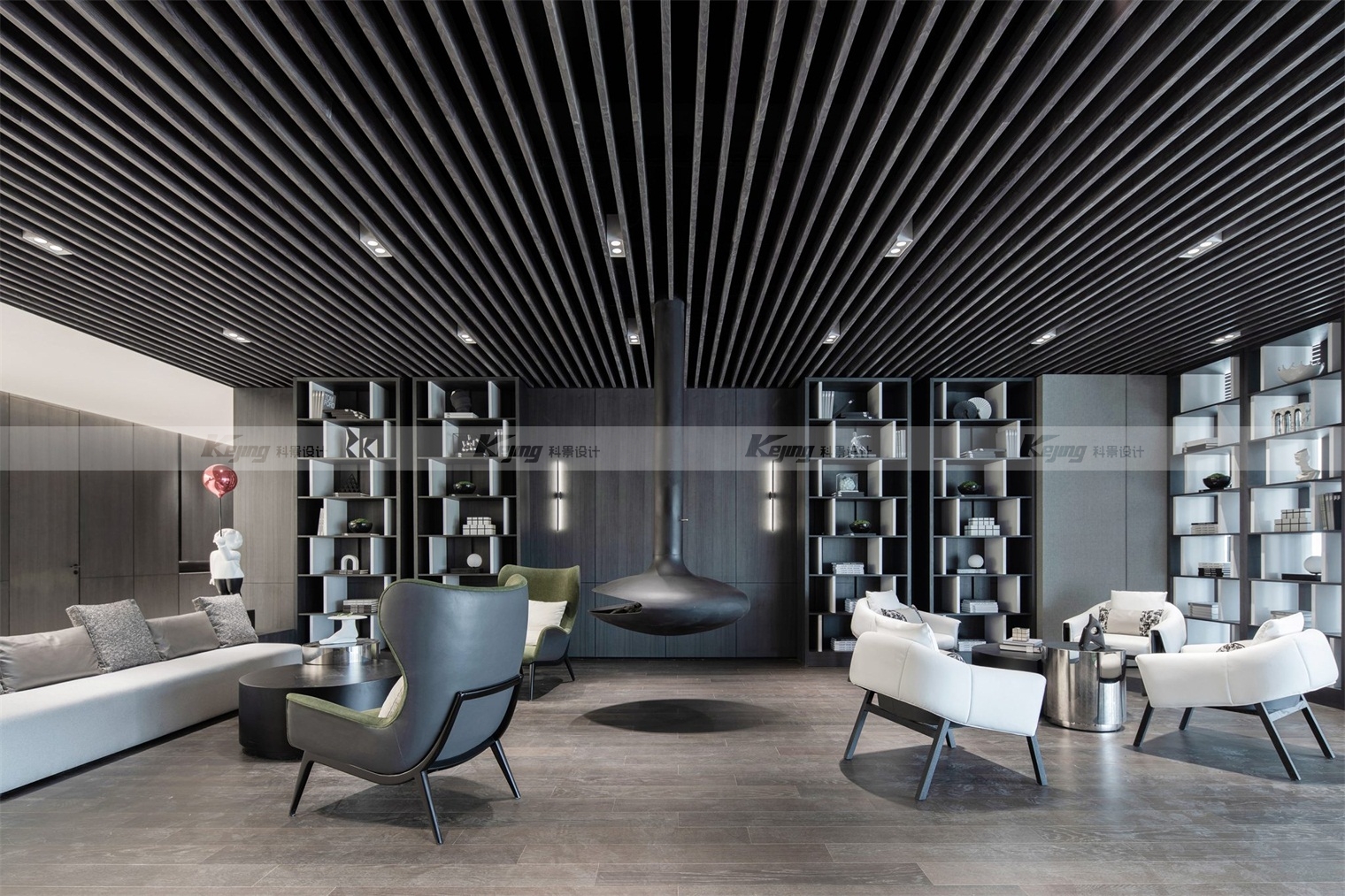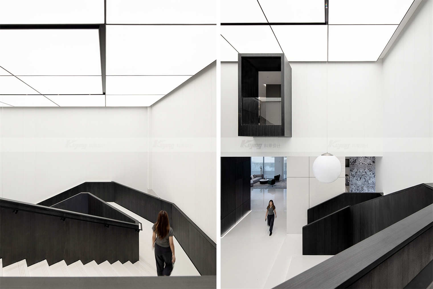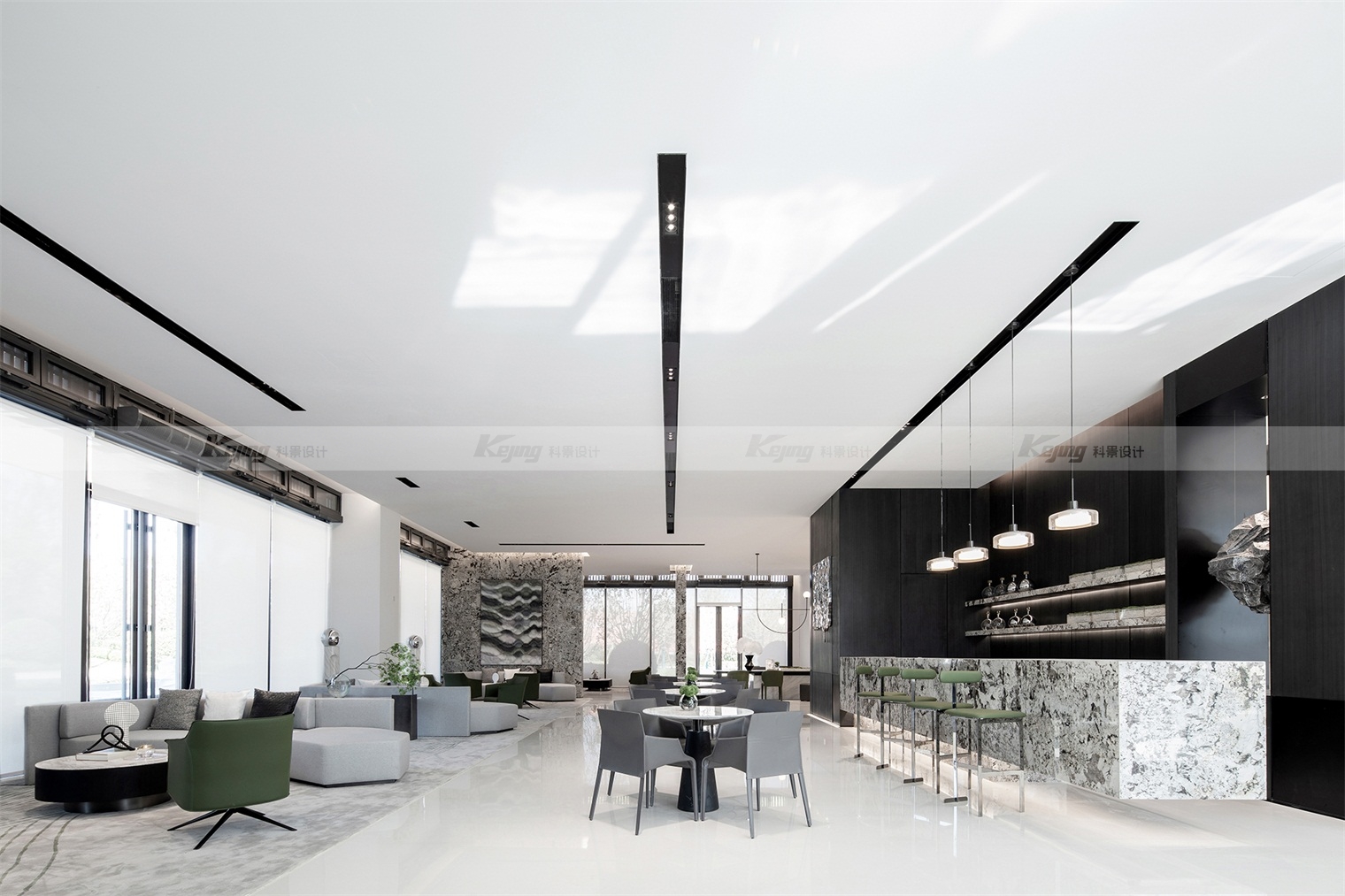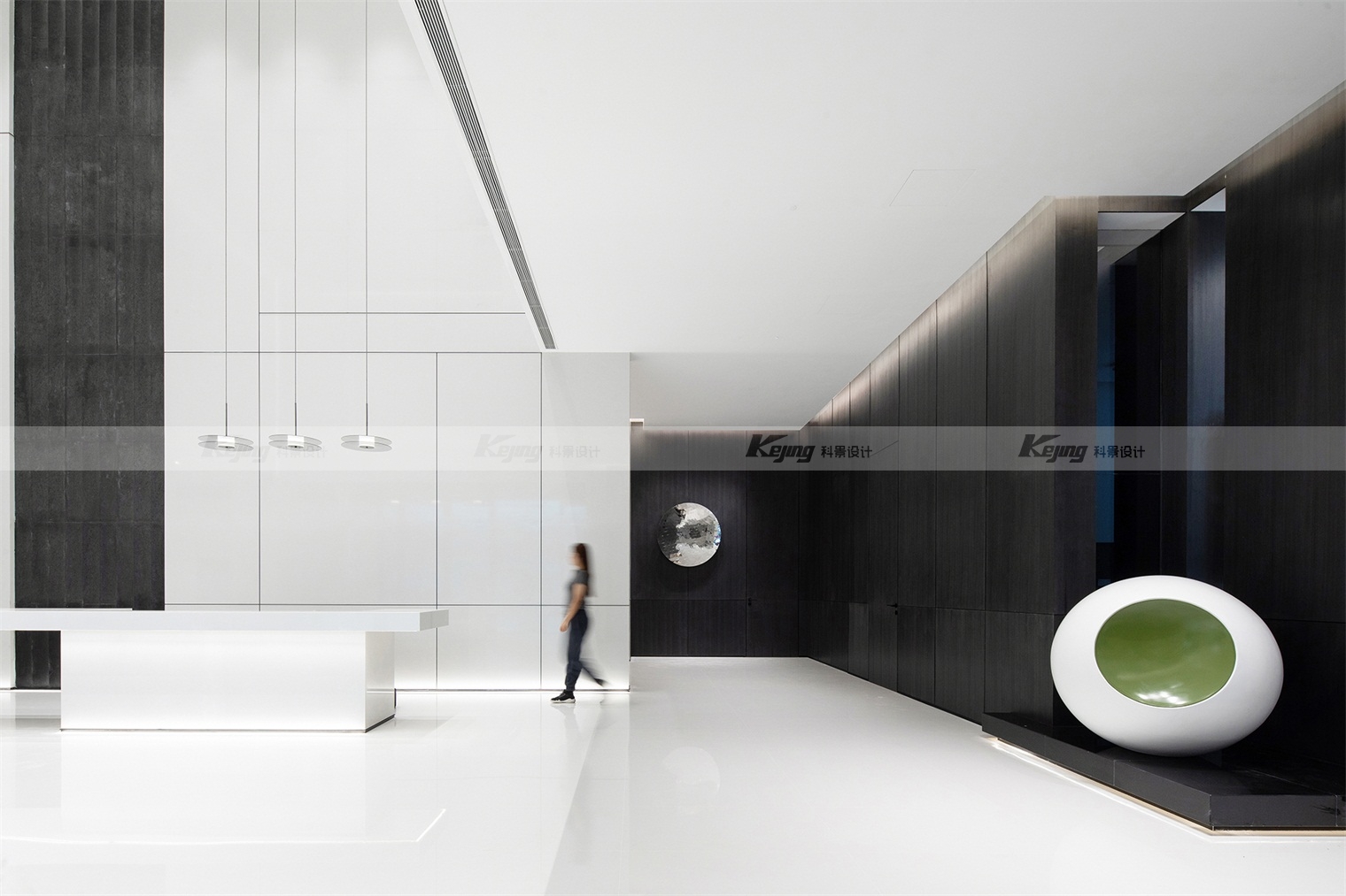 空间中,直线与折线将不同的功能区简明勾勒划分;大面积材质铺陈装饰弱化了不必要的细节;黑与白的交替、变幻如同明确的节奏韵律;艺术品和景观则是城市和山水之间雀跃的生命力。从一层到二层,万橡设计抽象构建了一座被山石、河流滋养的城市,又因为艺术品的置入与打破常规的结构笔触,将这座城市带入了充满想象的宇宙空间中。在结构、线条和色彩变化中,空间与这座城市一样,自成风骨。