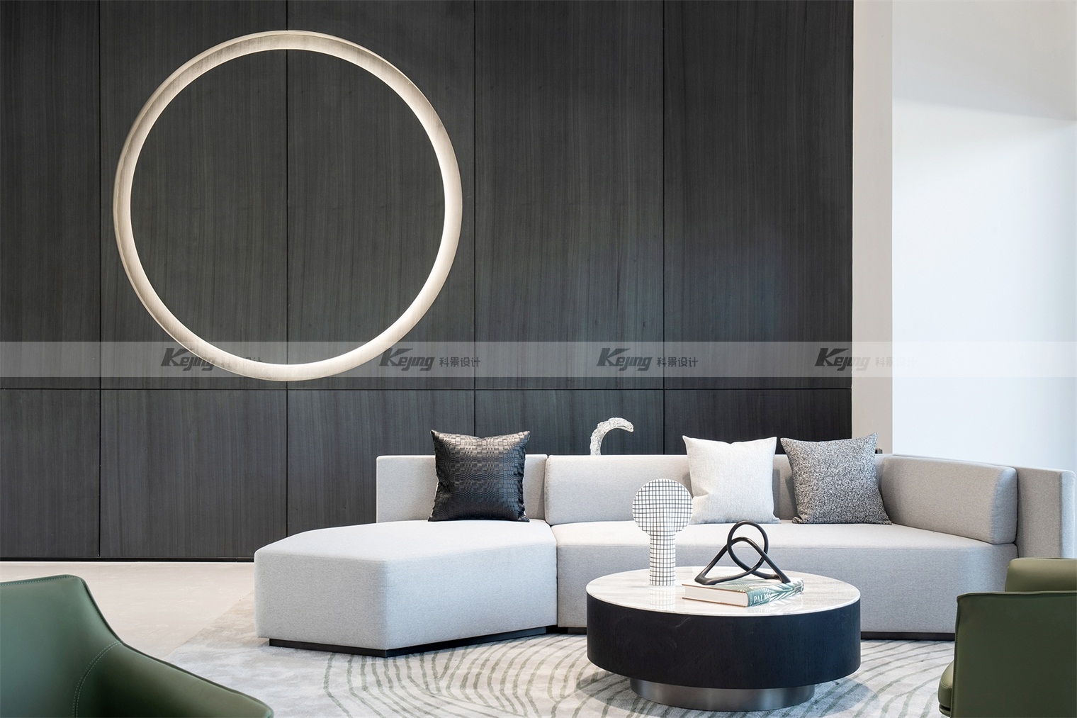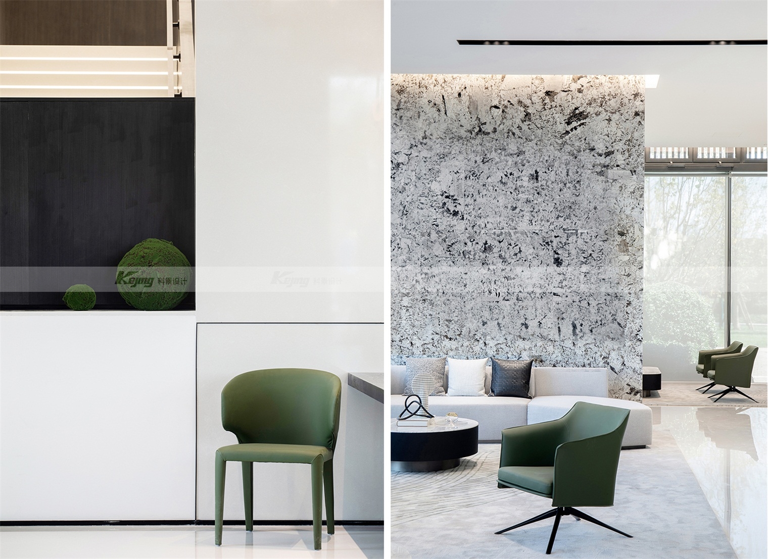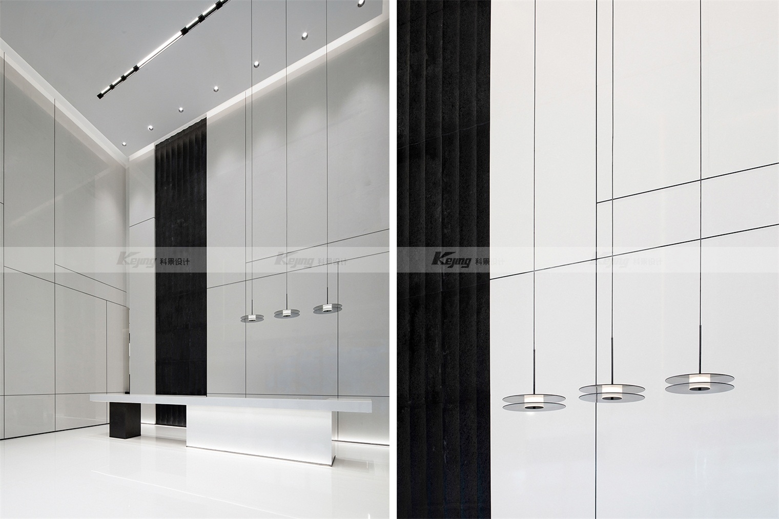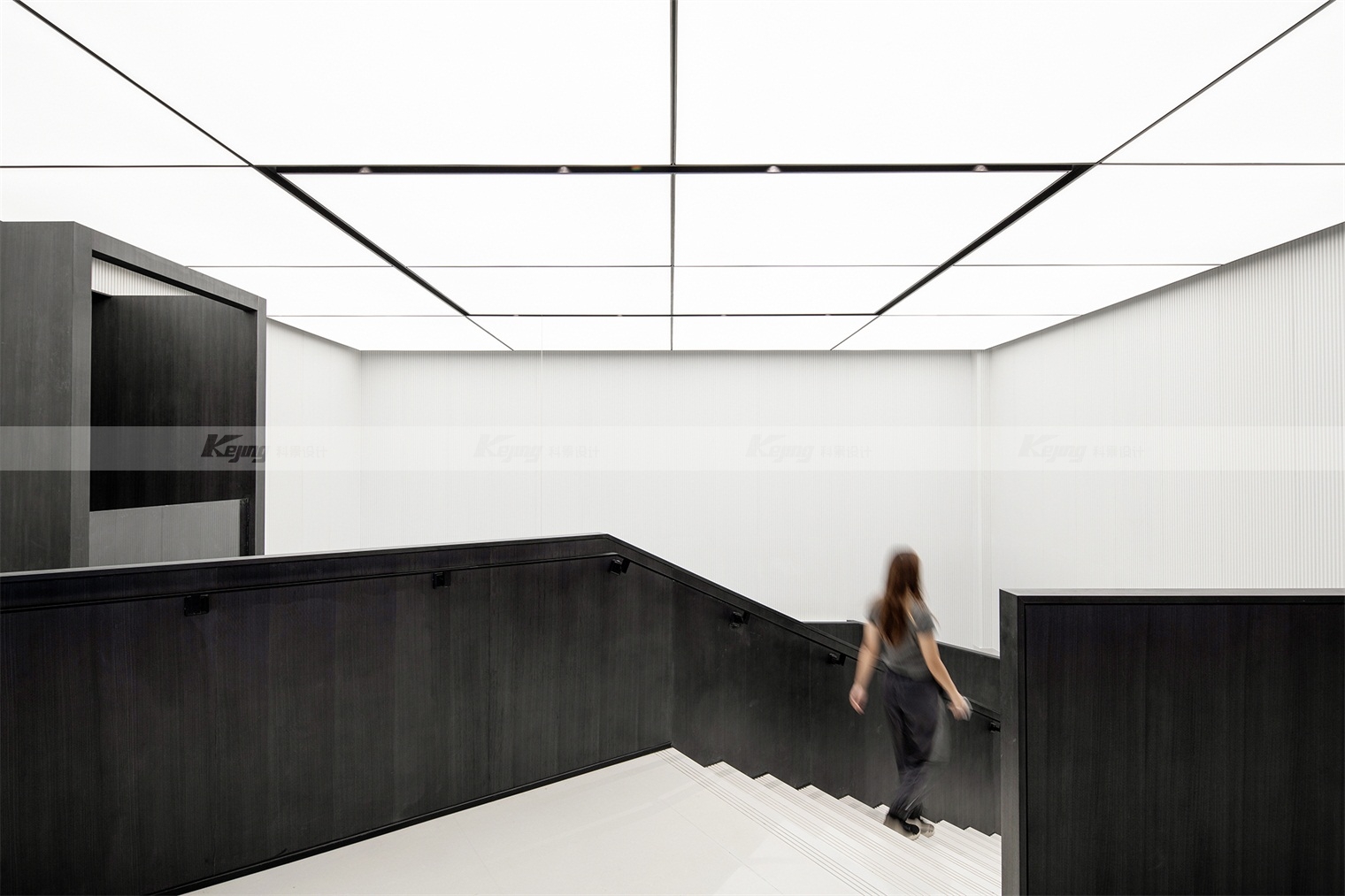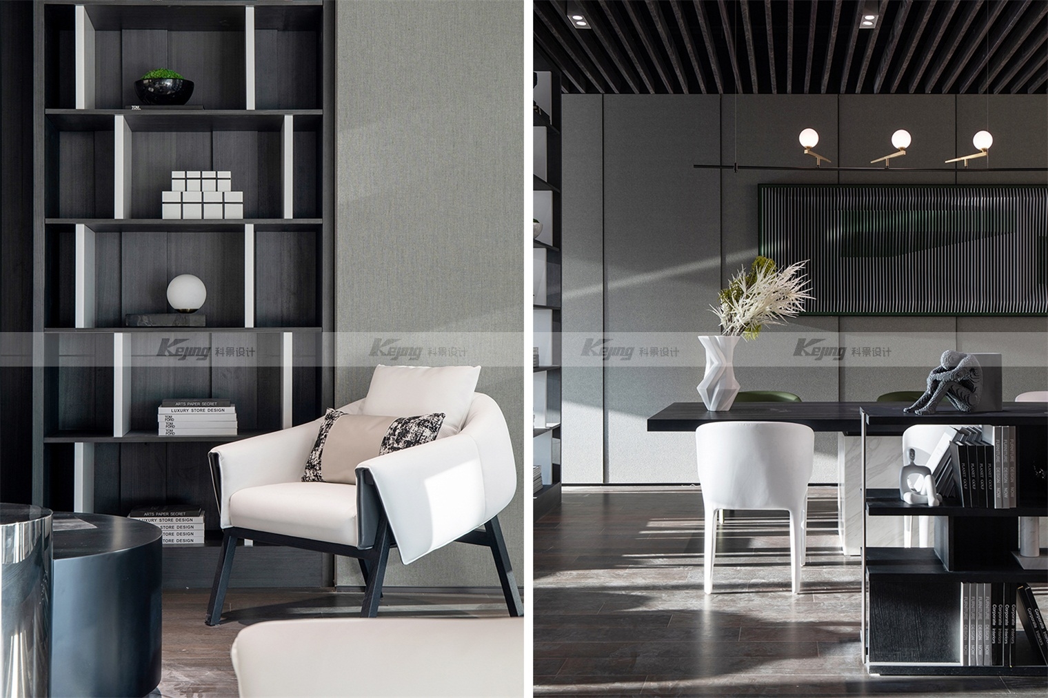 空间中,直线与折线将不同的功能区简明勾勒划分;大面积材质铺陈装饰弱化了不必要的细节;黑与白的交替、变幻如同明确的节奏韵律;艺术品和景观则是城市和山水之间雀跃的生命力。从一层到二层,万橡设计抽象构建了一座被山石、河流滋养的城市,又因为艺术品的置入与打破常规的结构笔触,将这座城市带入了充满想象的宇宙空间中。在结构、线条和色彩变化中,空间与这座城市一样,自成风骨。