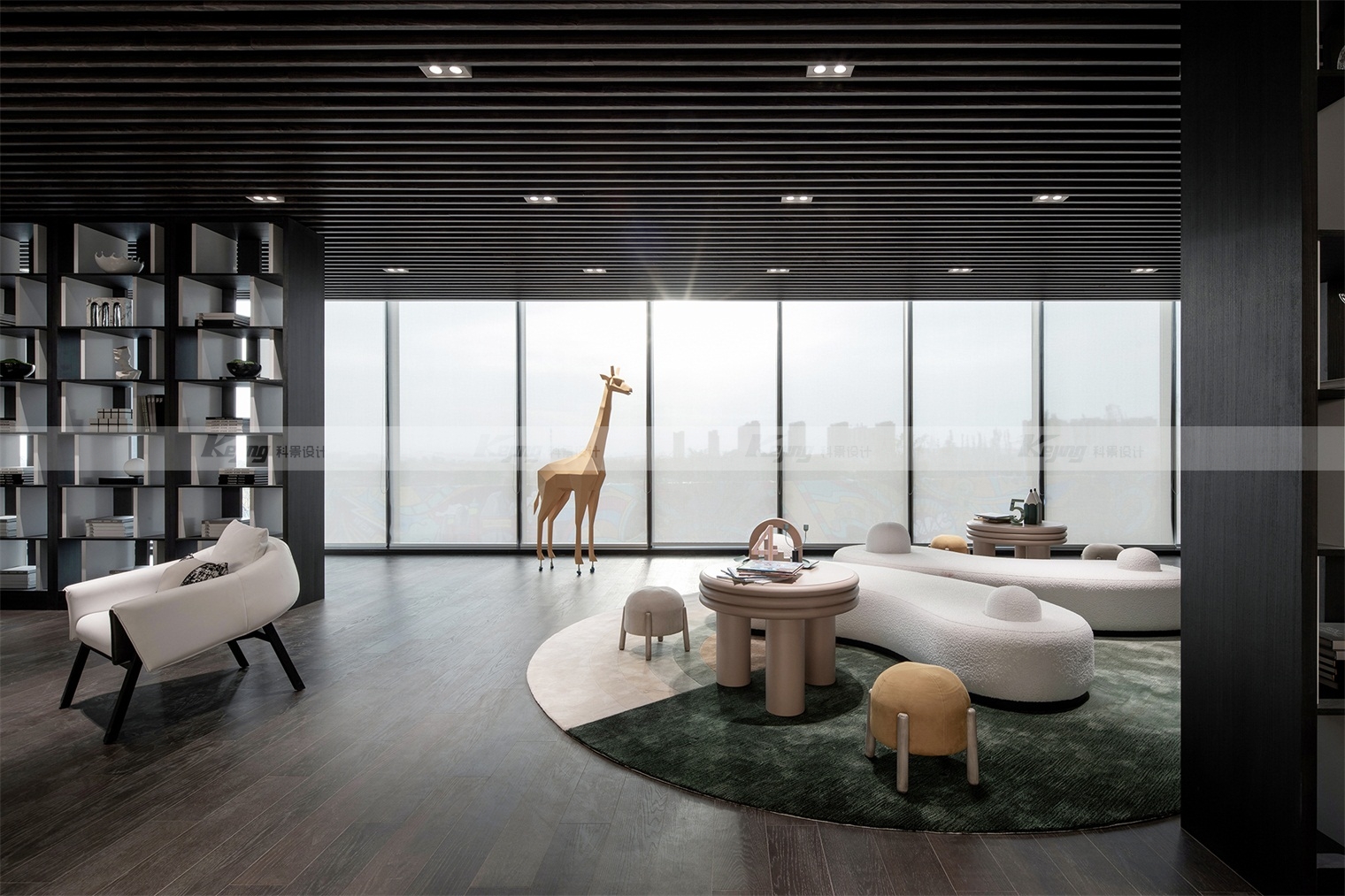 In space, straight lines and broken lines divide different functional areas. Large areas of material spread decoration weakens unnecessary details; The alternations of black and white, changing like a definite rhythm; Art and landscape are the life of the city and the landscape. From the first floor to the second floor, The design of Ten Thousand Oak tree abstractly constructs a city nourished by mountains and rocks and rivers, and also brings the city into the space full of imagination due to the installation of artworks and unconventional structural brushstrokes. In its structure, lines and color changes, the space, like the city, has its own character.