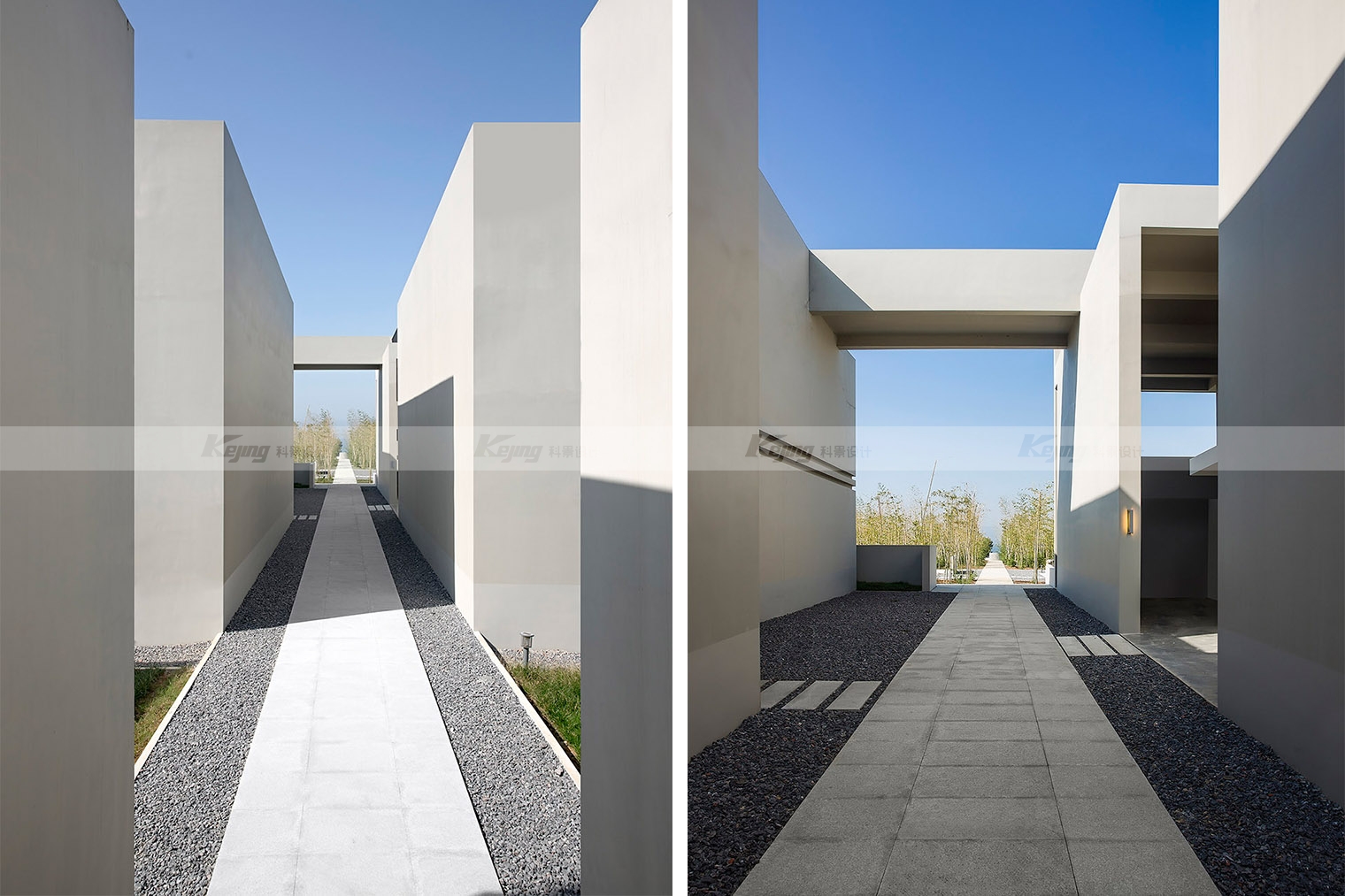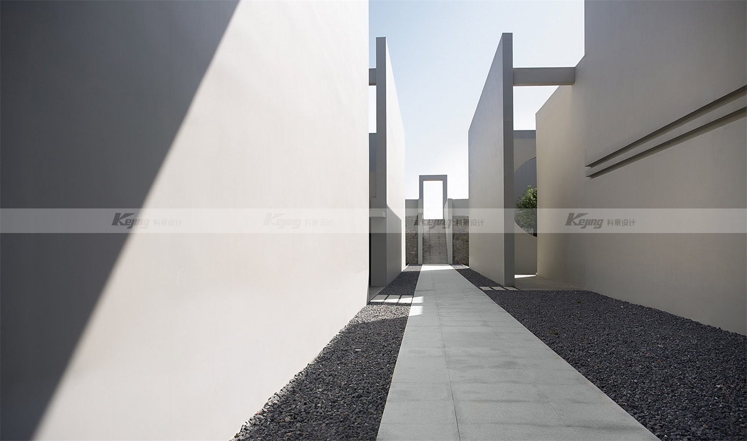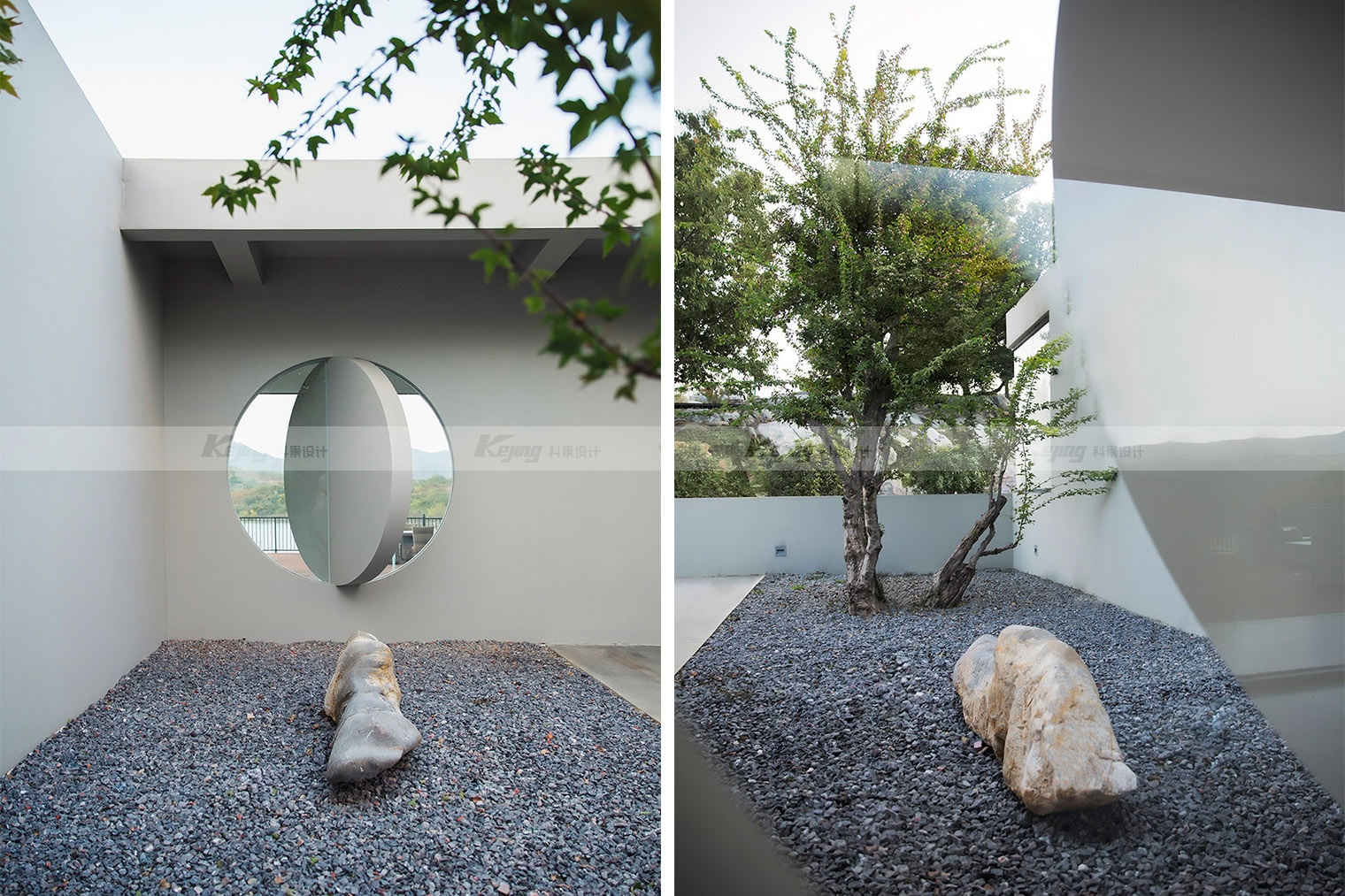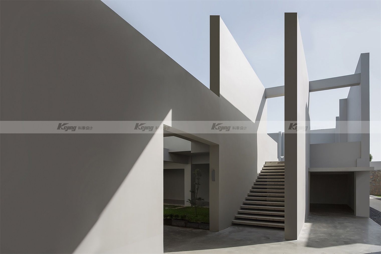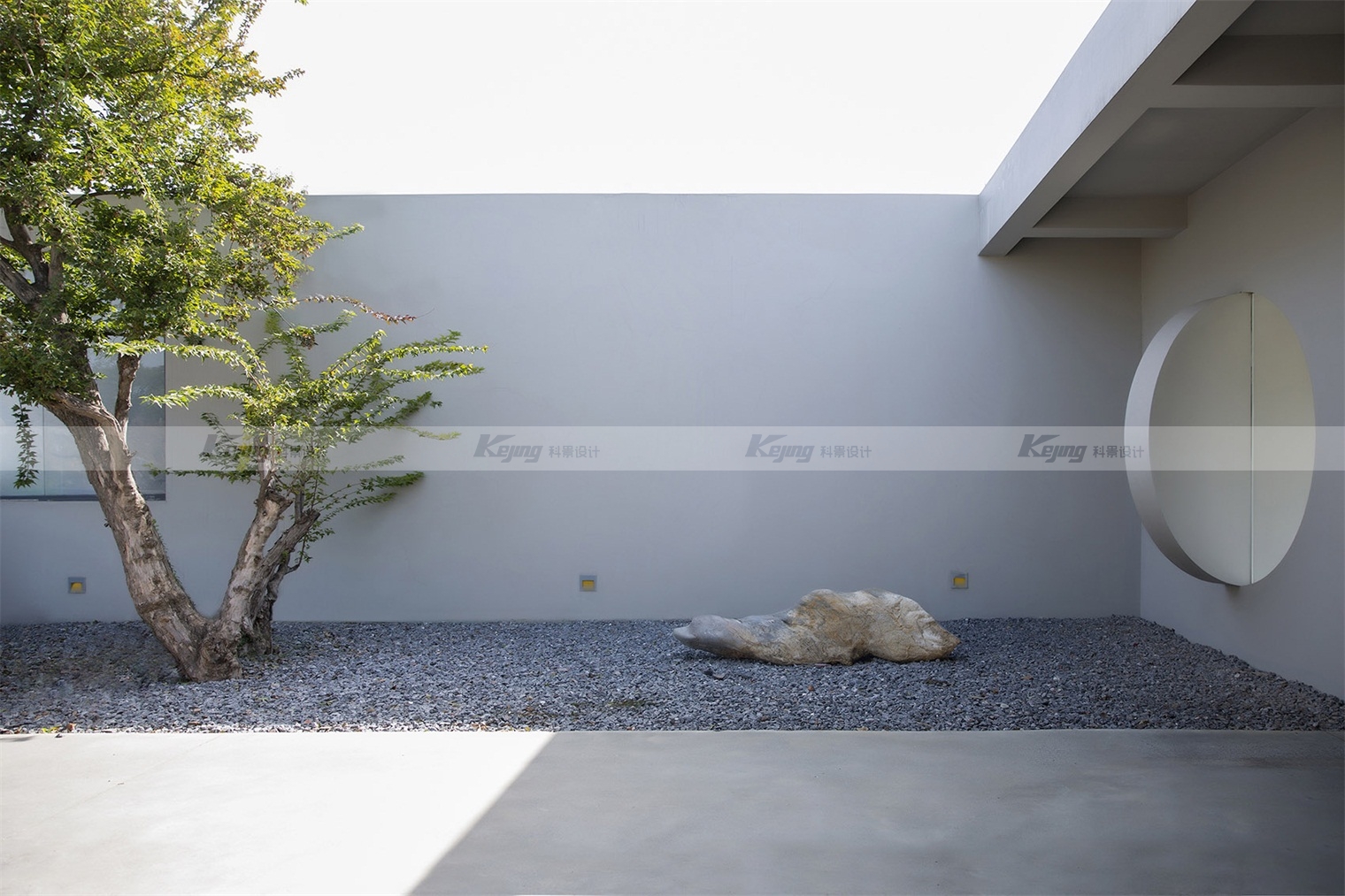 In the process of design, the designer made full use of the spatial relationship between sunlight and the wall to strengthen the sense of volume of the facade, using white to reflect the natural color changes, starting from the dialogue of the environment, to create a neutral and pure space experience. "The square and the circle complement each other, life is comfortable in the square and the circle". The wisdom of the square and the circle is borrowed in the architectural group to break the limitation of traditional architecture and make the space rich in more levels of change. The designer cleverly uses the round hole structure and adds landscape elements to add a vitality to the elegant and clean architectural space.
