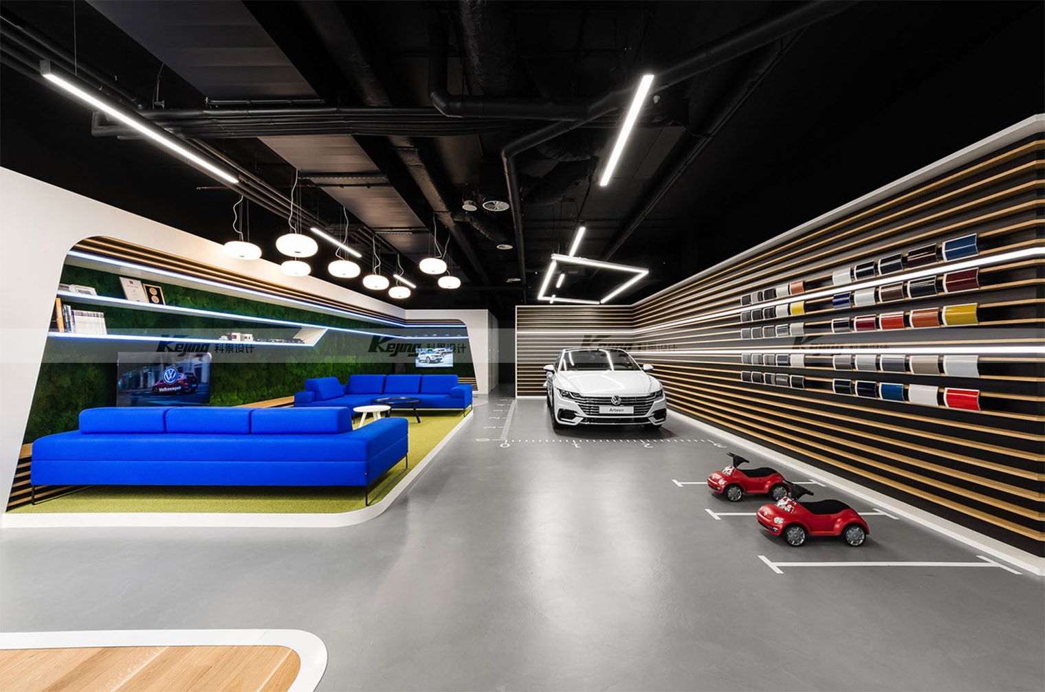 Volkswagen wanted to give users a sense of safety and to feel at home in the car, creating an intimate area to enhance customer personalisation. In such a home-like space, customers can customize their dream cars. We also incorporated wood and real moss into the showroom, taking full advantage of vw's style and technology as well as its driverless cars. A wall made of horizontal panels was designed to mimic a Volkswagen grille; Artificial products and the new T-ROC style can also be seen in the light of the showroom. It takes the form of a new design line in vw's latest models. The sense of science and technology combined with the atmosphere of home is further reflected in the minimalist lighting form.