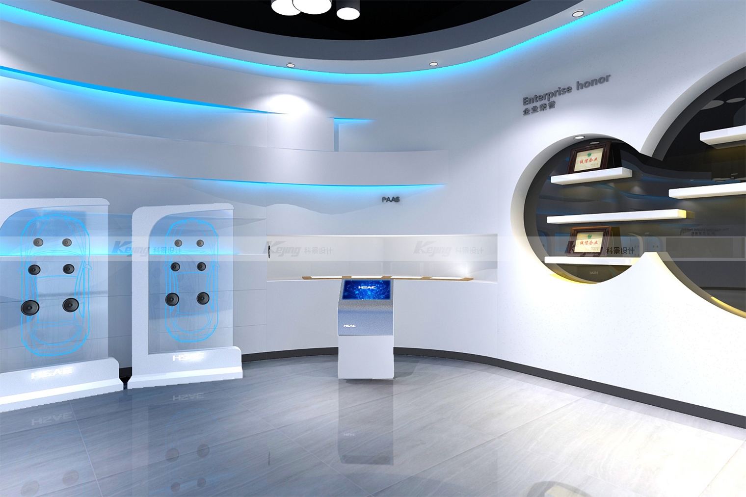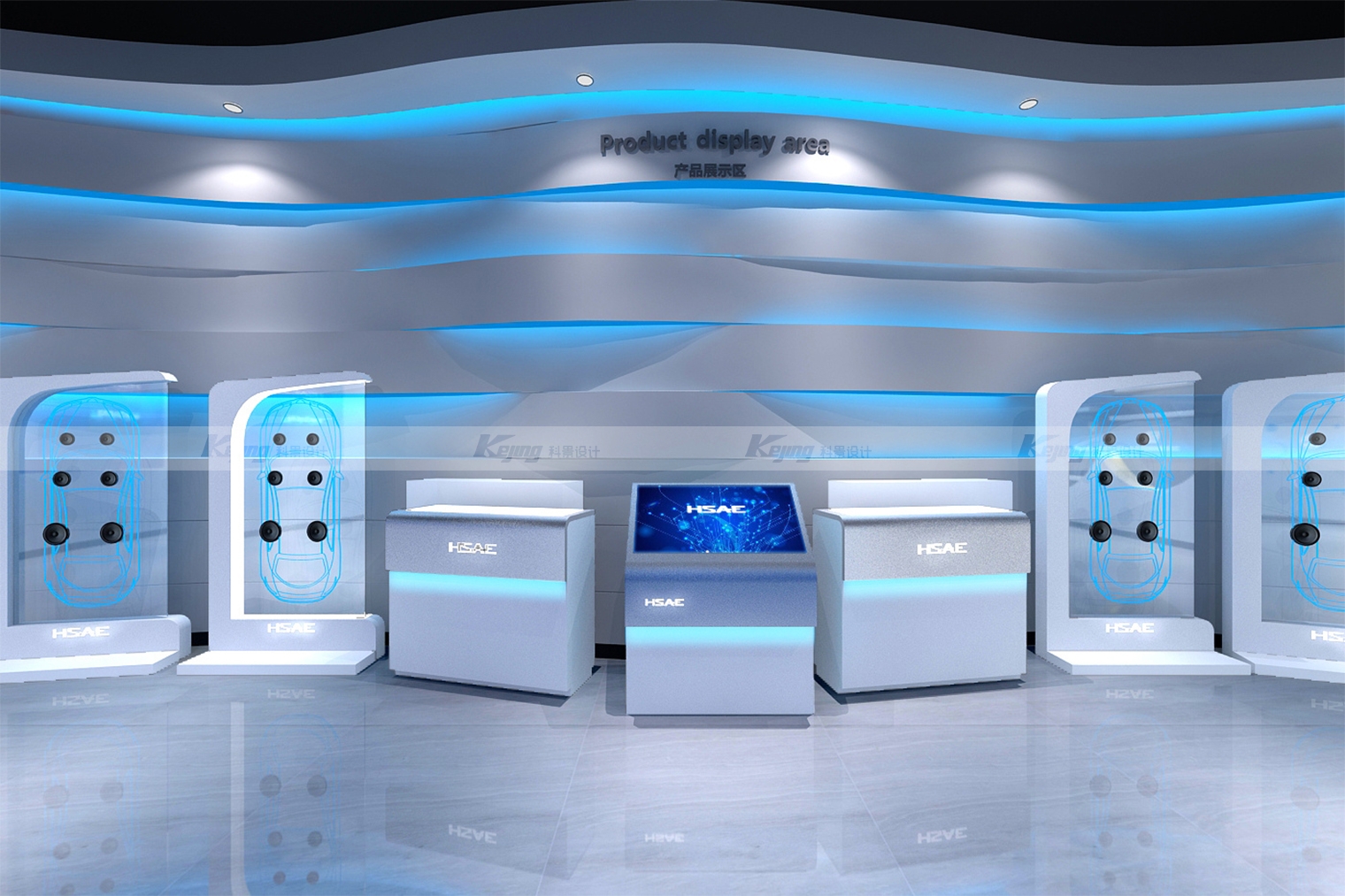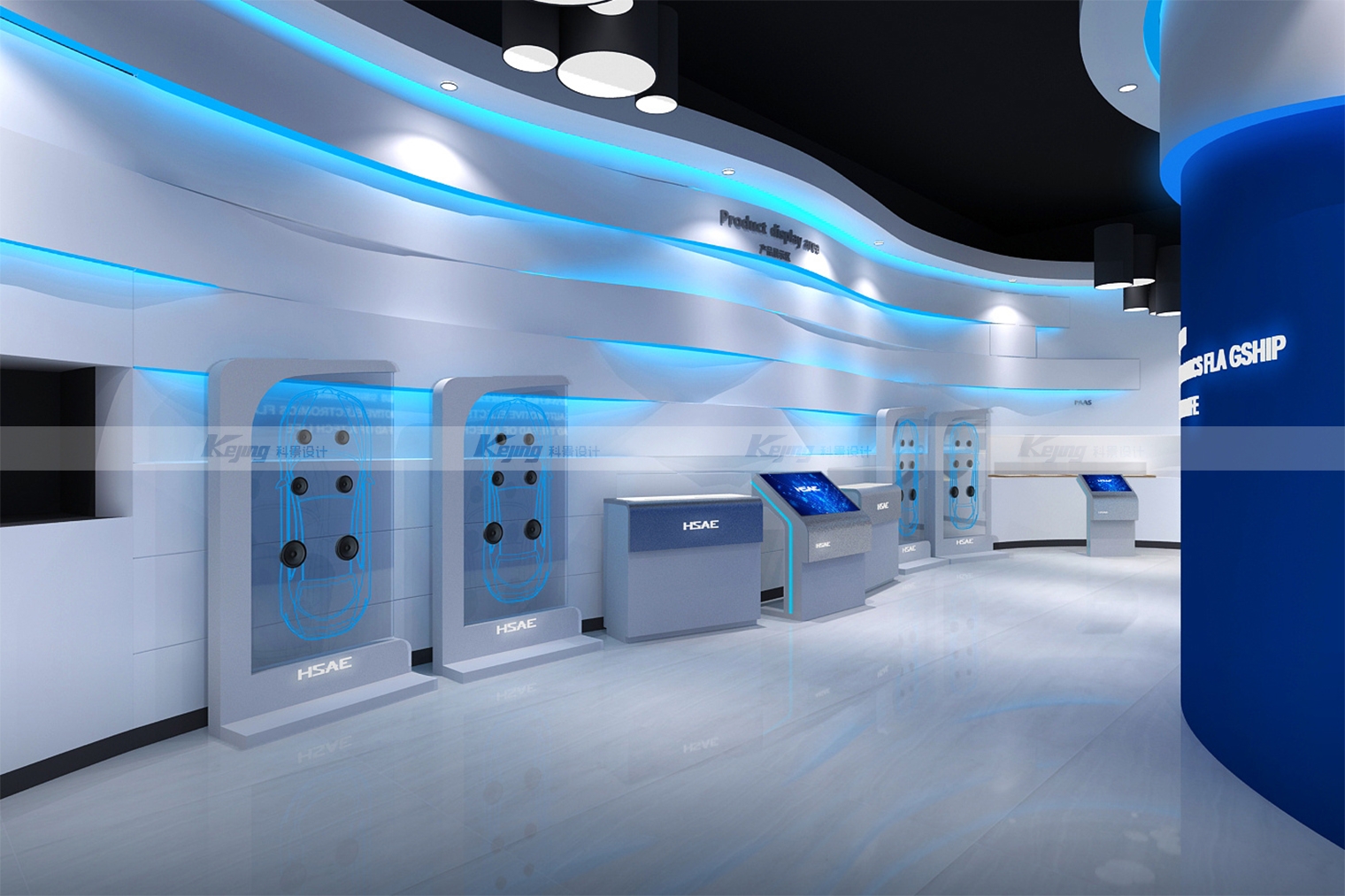 Hangsheng Electronics, China's automotive electronics industry leading enterprises. The construction of the exhibition hall of the enterprise in this case USES advanced means to integrate digital model, 3D animation, planning effect, virtual simulation, multimedia interaction and so on, so that visitors can more truly feel the convenience brought by the product. The main body of the exhibition hall is a combination of blue and white. With blue technology and white atmosphere, the exhibition hall is composed, dignified and scientific and technological. Combined with the lighting effect, it effectively attracts the attention of visitors. This exhibition hall focuses on the lighting effect. Different lighting sets off different products. The color matching of lighting can highlight the coordination of the whole brand and enhance the display value.