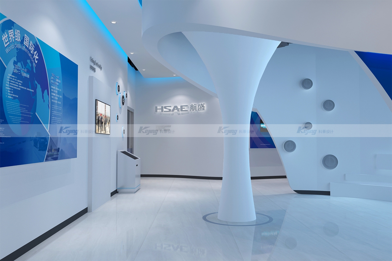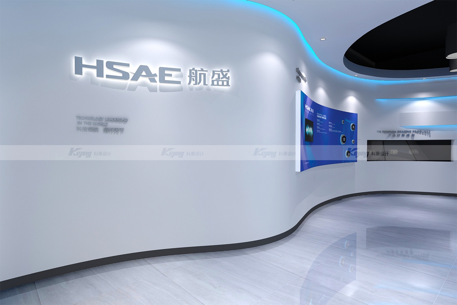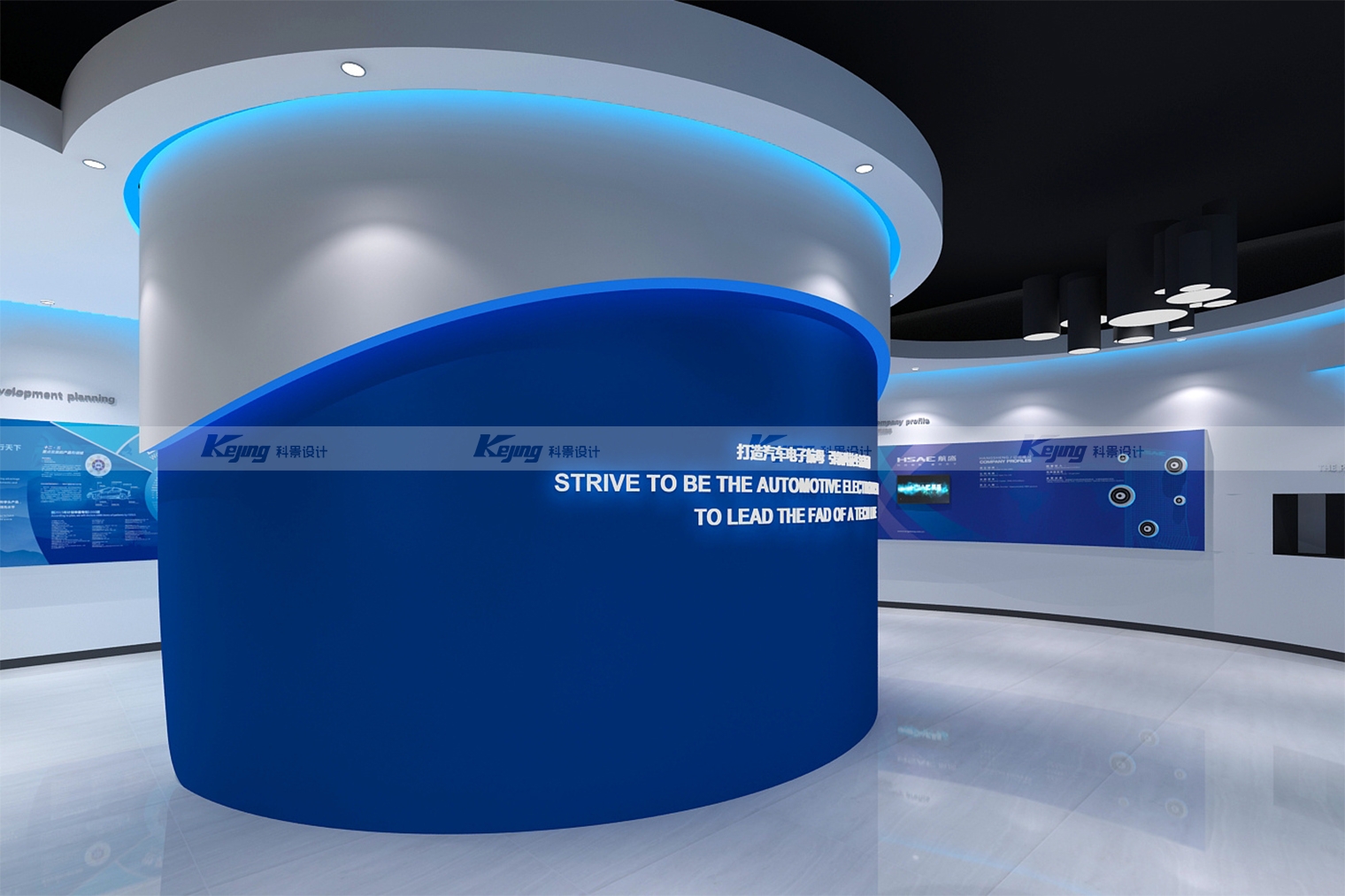 航盛电子,是中国汽车电子行业龙头企业。本案企业展厅的建设上运用先进的手段,将数字化模型、三维动画、规划效果、虚拟仿真、多媒体互动等相互交融,让参观者能够更真切地感受产品带来的便捷。展厅内部主体为蓝色白色相结合,蓝色科技,白色大气,整体显得沉稳、大气、庄重、具有科技感,加上灯光效果,有效地吸引了参观者的眼球。这个展厅重在灯光效果,不同的灯光烘托不同的产品,展台的灯光色系搭配可以彰显整个品牌协调性,提升展示价值。