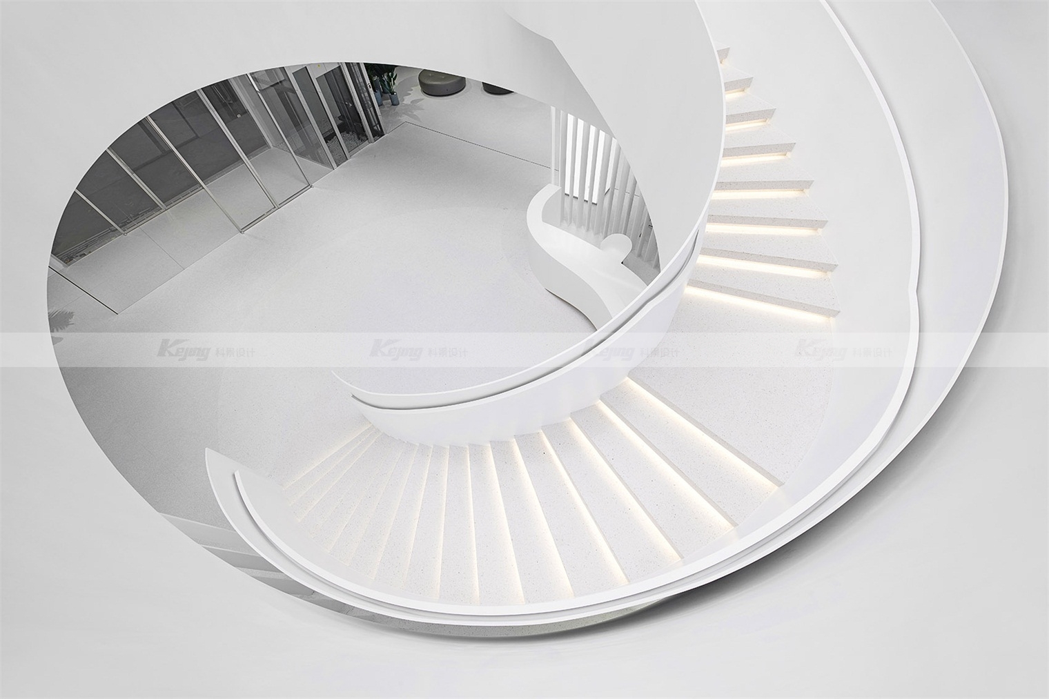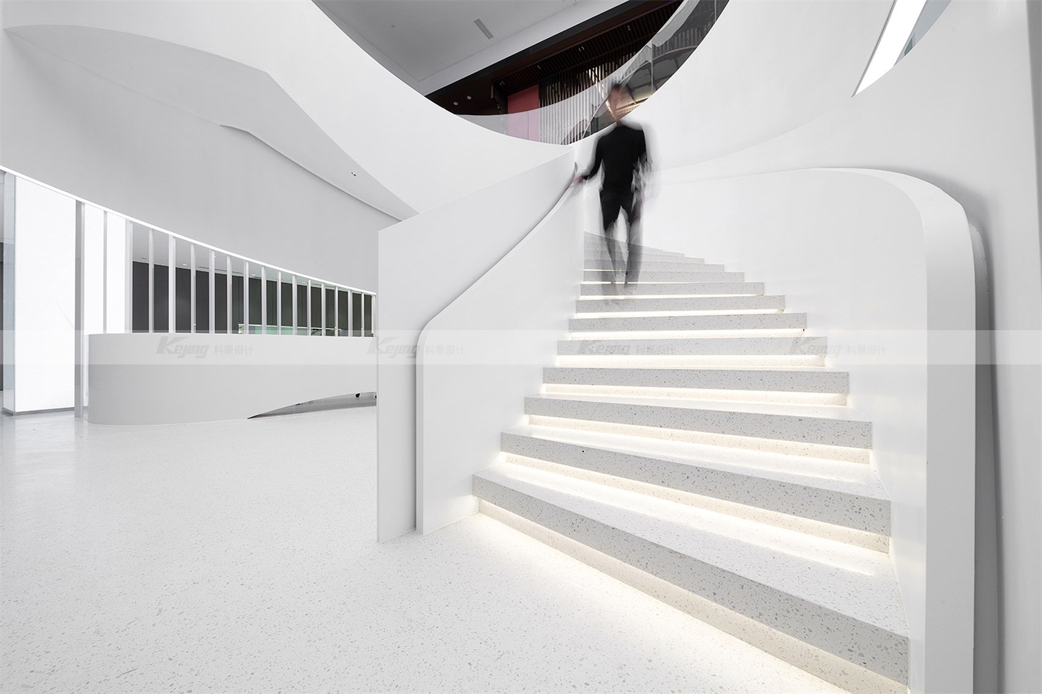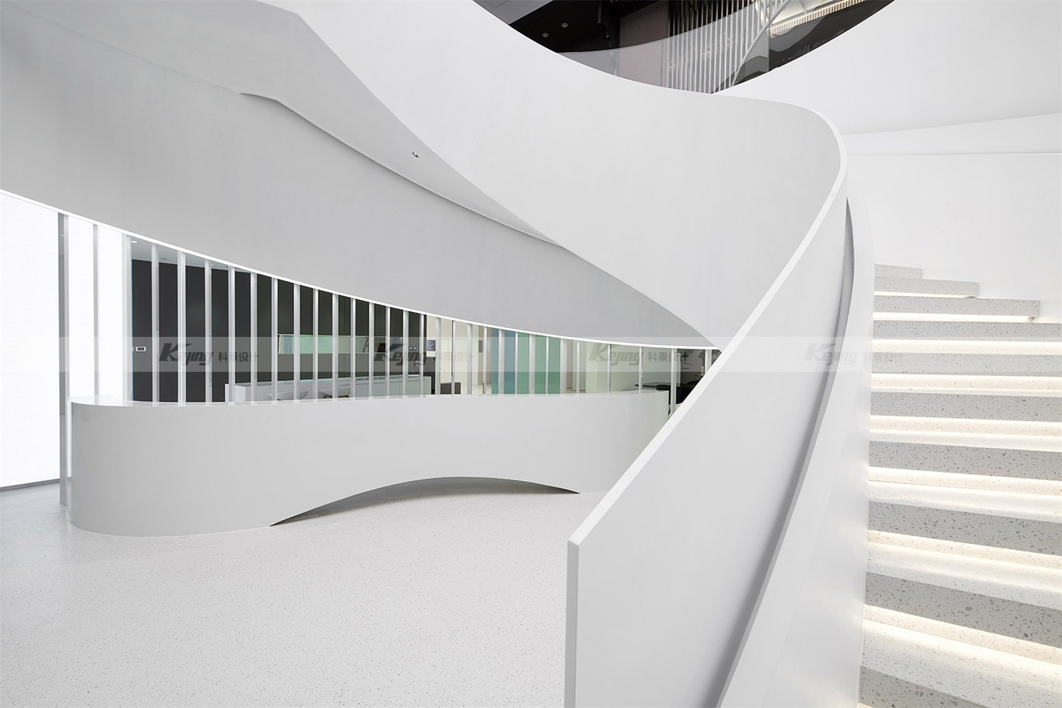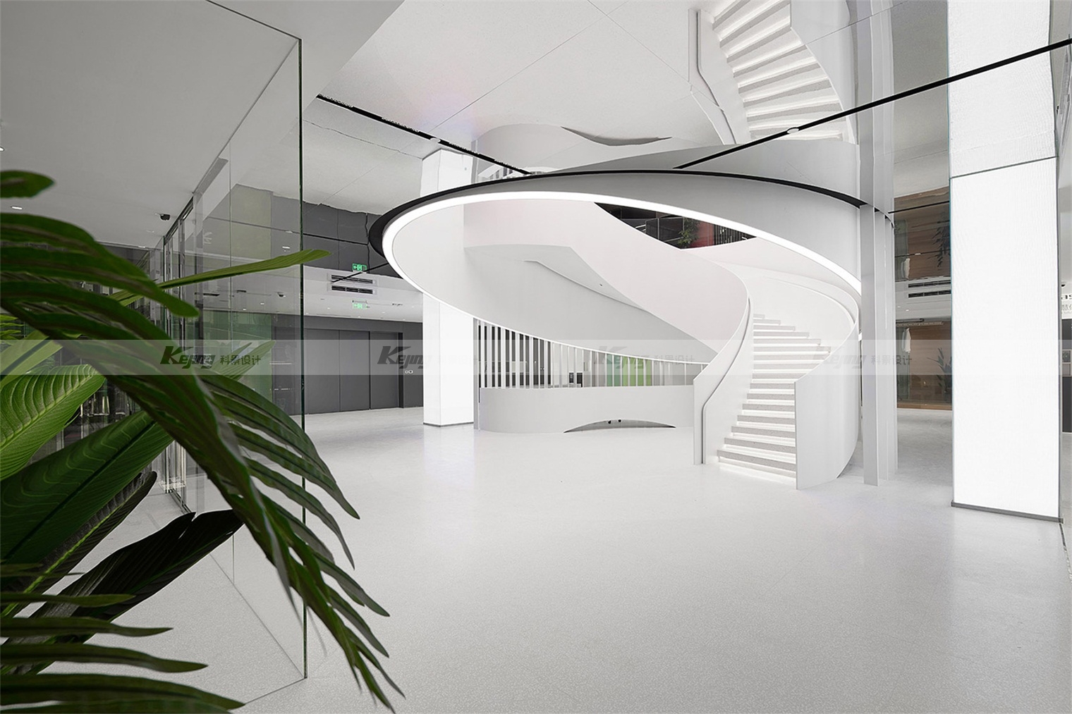 Haier is the first company in the world to launch "one-stop smart home solution". The project is located in the "busy" home city. The design thought is, how to create a "peaceful" atmosphere for visitors? Enables visitors to learn about brands, products and services with a relaxed mindset. We used translucent panels for the facade, and a white box reflecting the sunlight stood out from the placard filled with shops. At night the box gives off a soft white light and becomes a beautiful beacon. From a distance, a luminous ring spins in the middle of the hall, like a magic vortex that invites you to explore more. The four cylinders wrapped in the LED screen bloom around the ring. Step into the circle, follow the spiral staircase into the atrium, and you will see a 10-meter-high curved screen. Give visitors a 360-degree visual experience. The pure white terrazzo, artificial stone and polished gray mirror palette in the lobby space evoke both the aesthetic of the fashion avant-garde and the ecological wisdom of the brand.