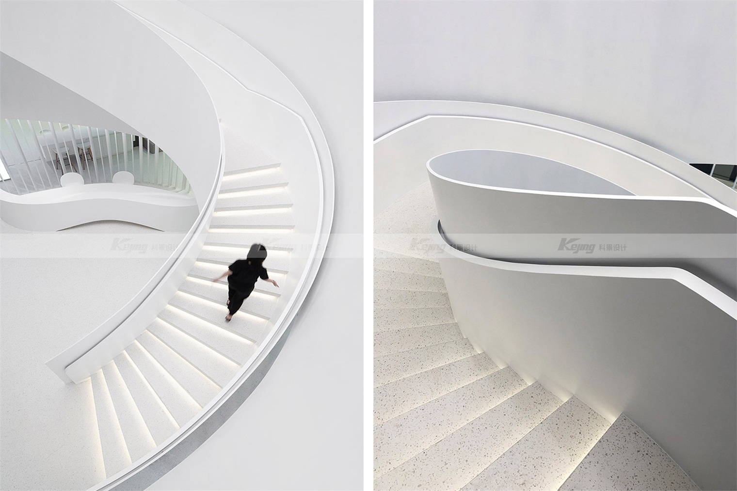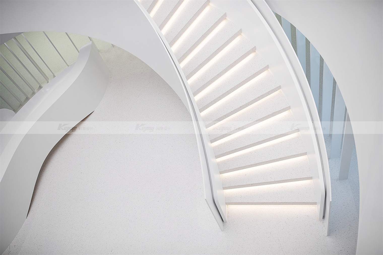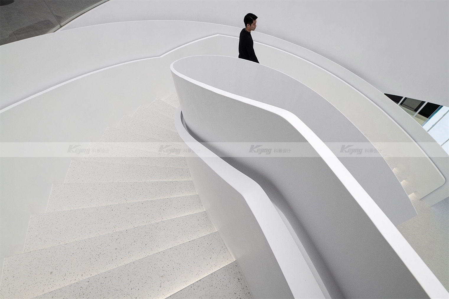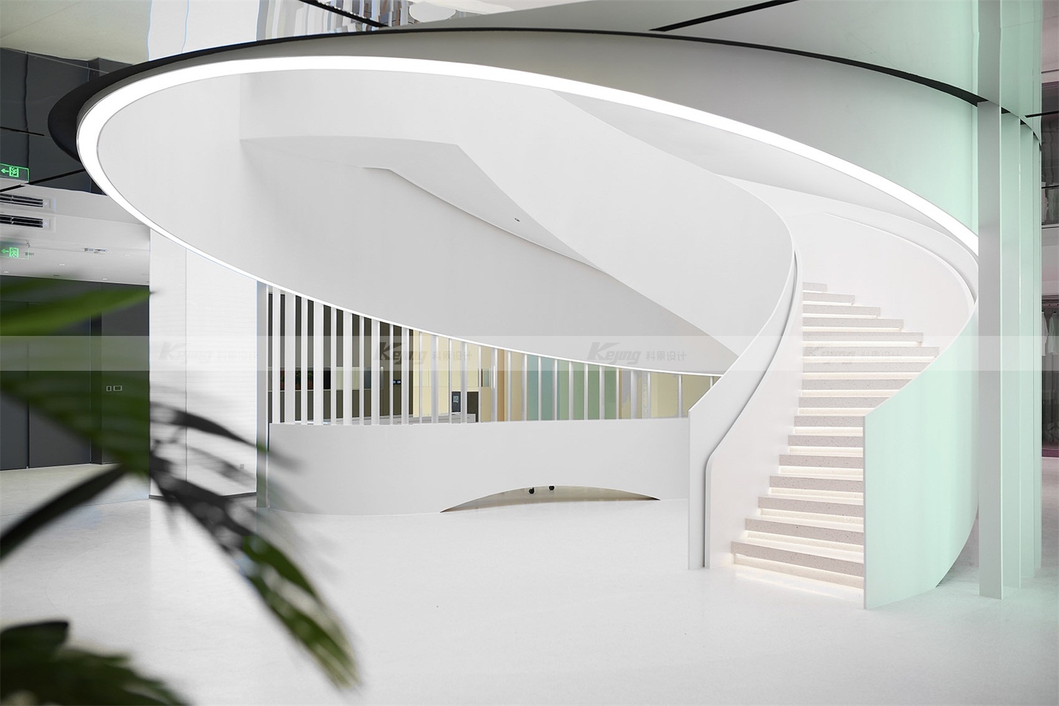 Haier is the first company in the world to launch "one-stop smart home solution". The project is located in the "busy" home city. The design thought is, how to create a "peaceful" atmosphere for visitors? Enables visitors to learn about brands, products and services with a relaxed mindset. We used translucent panels for the facade, and a white box reflecting the sunlight stood out from the placard filled with shops. At night the box gives off a soft white light and becomes a beautiful beacon. From a distance, a luminous ring spins in the middle of the hall, like a magic vortex that invites you to explore more. The four cylinders wrapped in the LED screen bloom around the ring. Step into the circle, follow the spiral staircase into the atrium, and you will see a 10-meter-high curved screen. Give visitors a 360-degree visual experience. The pure white terrazzo, artificial stone and polished gray mirror palette in the lobby space evoke both the aesthetic of the fashion avant-garde and the ecological wisdom of the brand.